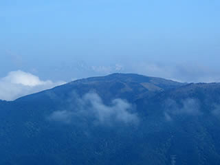 鉢伏山をズーム。その向こうに白い穂高岳が少しだけ見えています。
