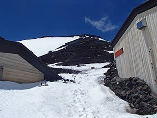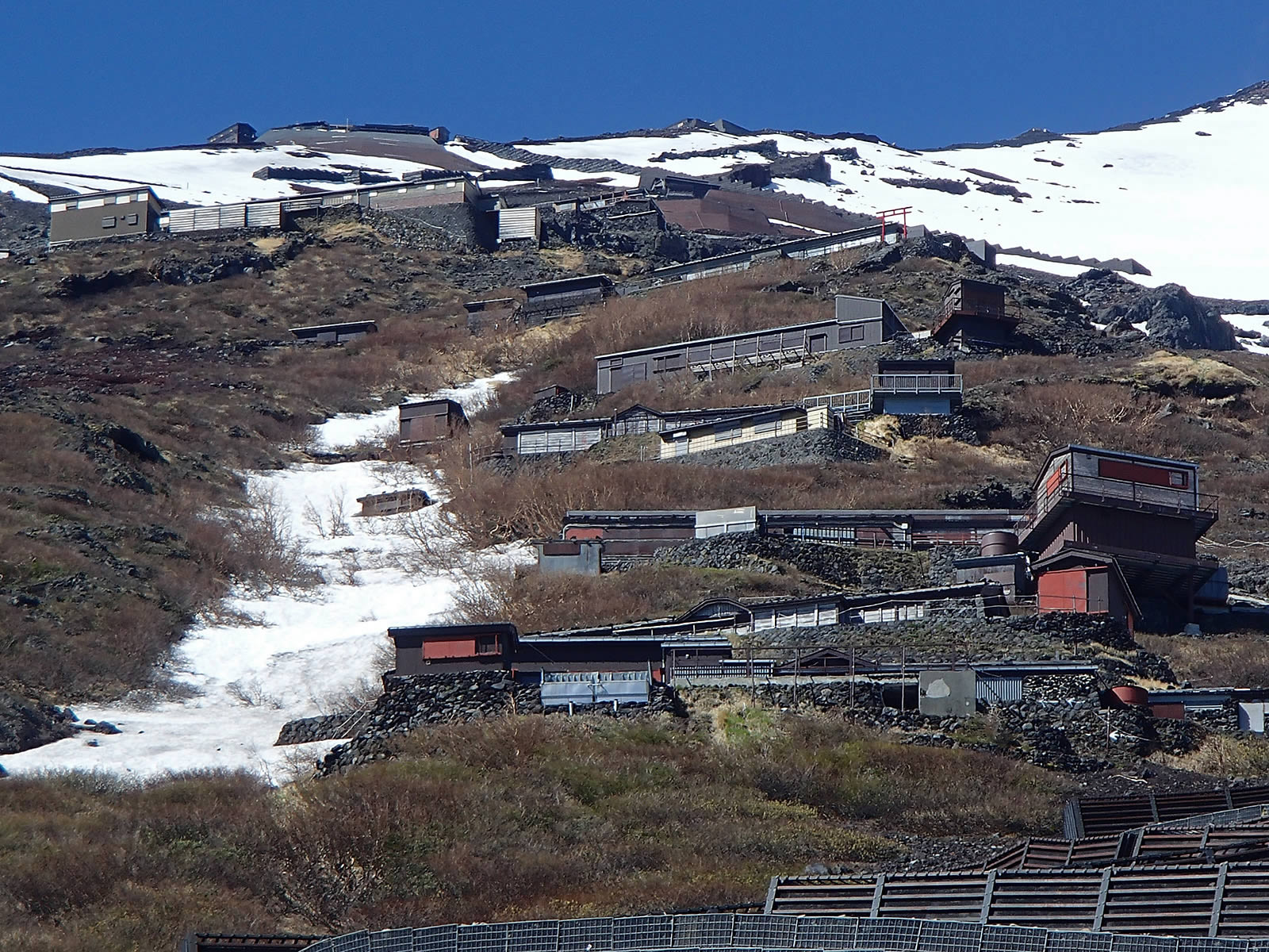 七合目の小屋群をズーム。隣の雪渓もだいぶ雪が減りました。今回は基本的に夏道登山道を進みましたが、雪が適度に緩んでいたため、結局山頂までアイゼン無しで登ってしまいました。