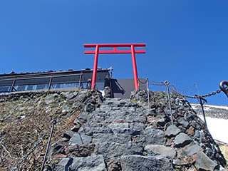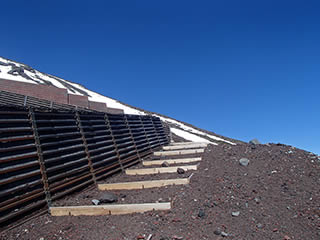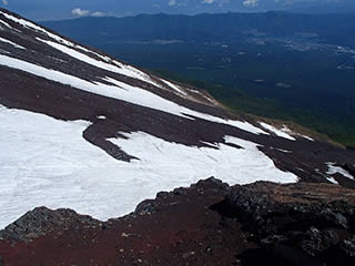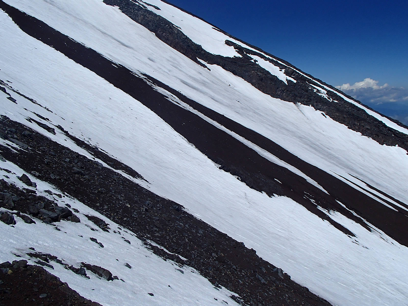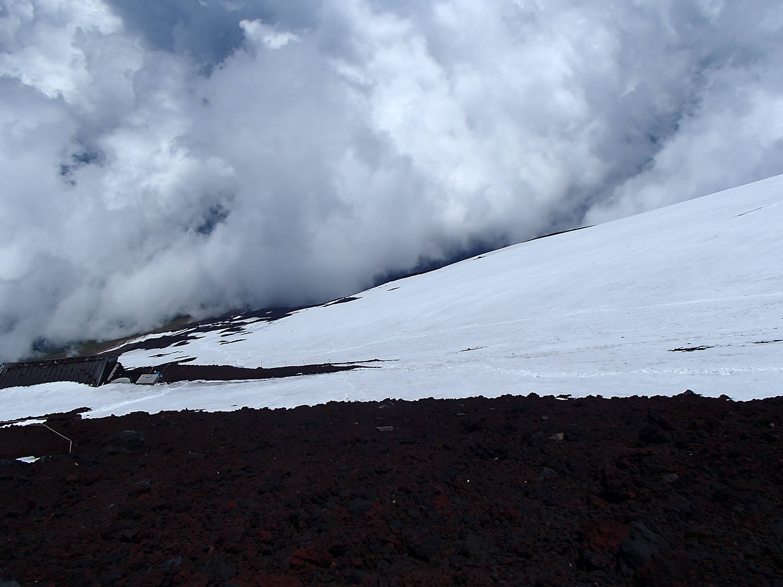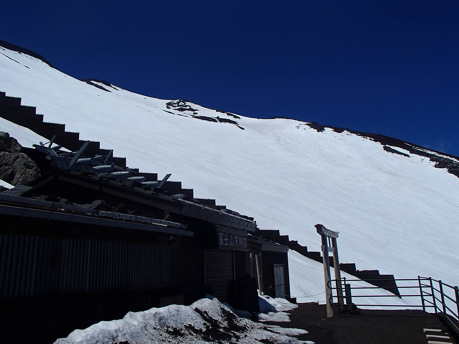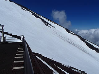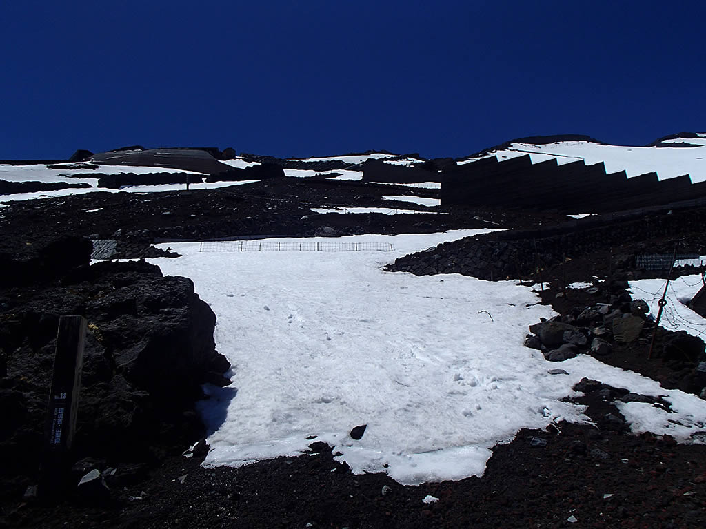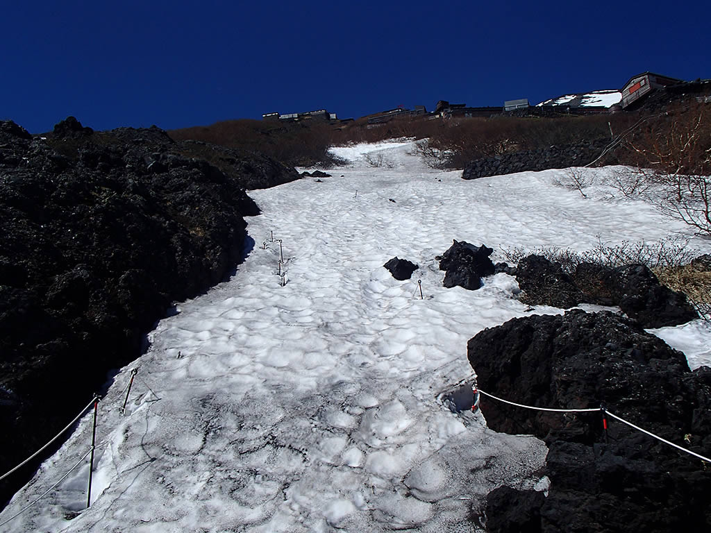 本八合目手前の一面の雪の斜面がありますが、ここは建物手前で一部雪の堅い部分がありましたので、アイゼンの方が楽に歩けると思います。