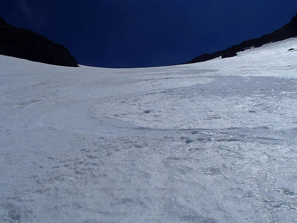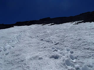 ここから見る限り雪渓もきれいで石が少なめかと感じましたが、実際に滑って見たら小さい石がたくさん埋まっていました(^^;。
