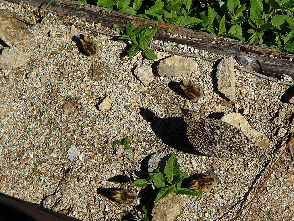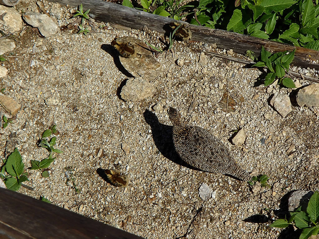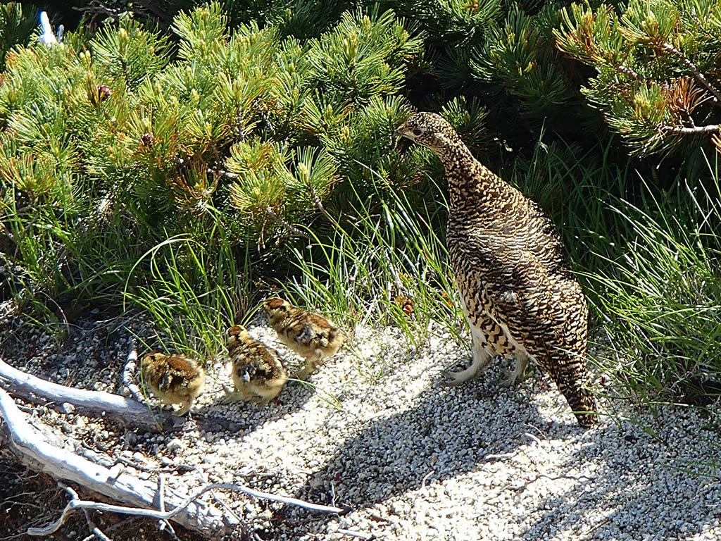 雷鳥が雛と一緒に散歩していました。