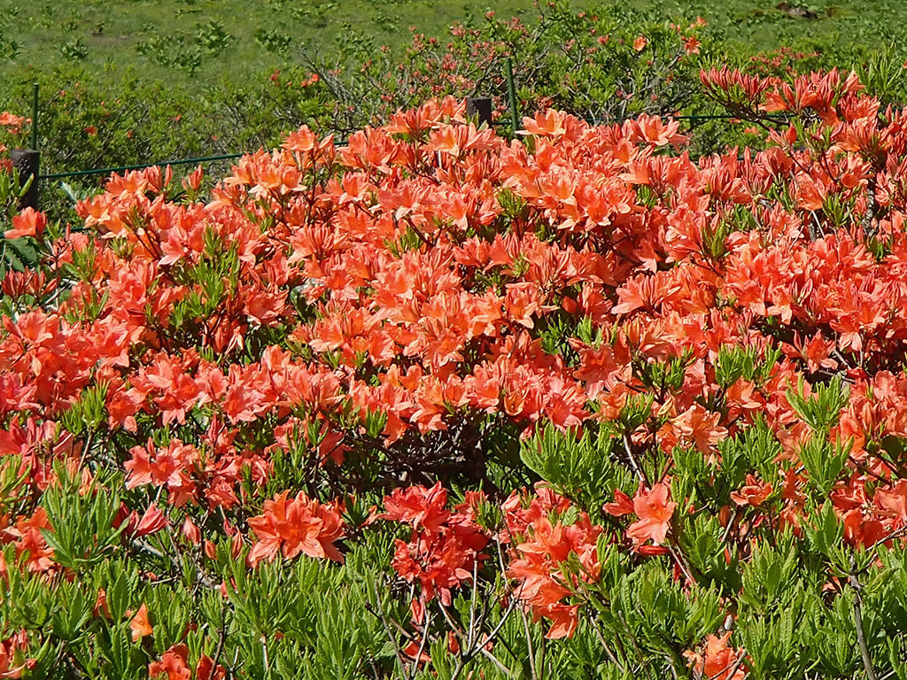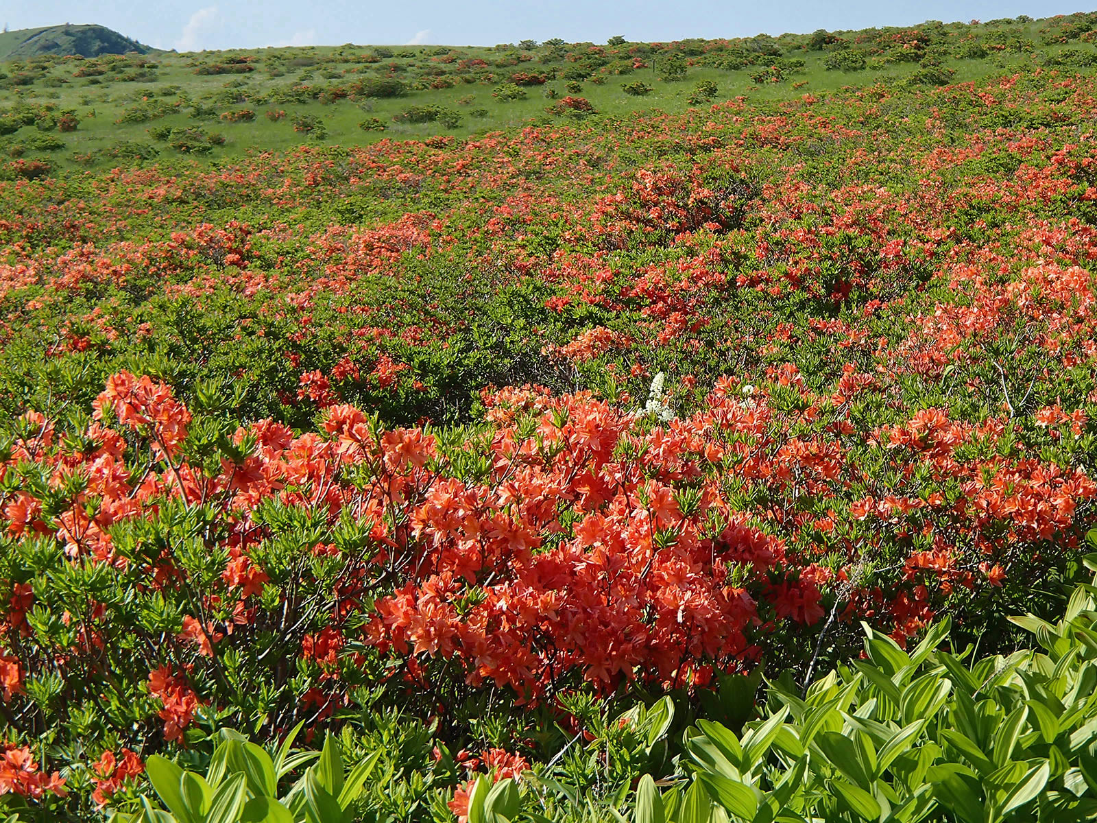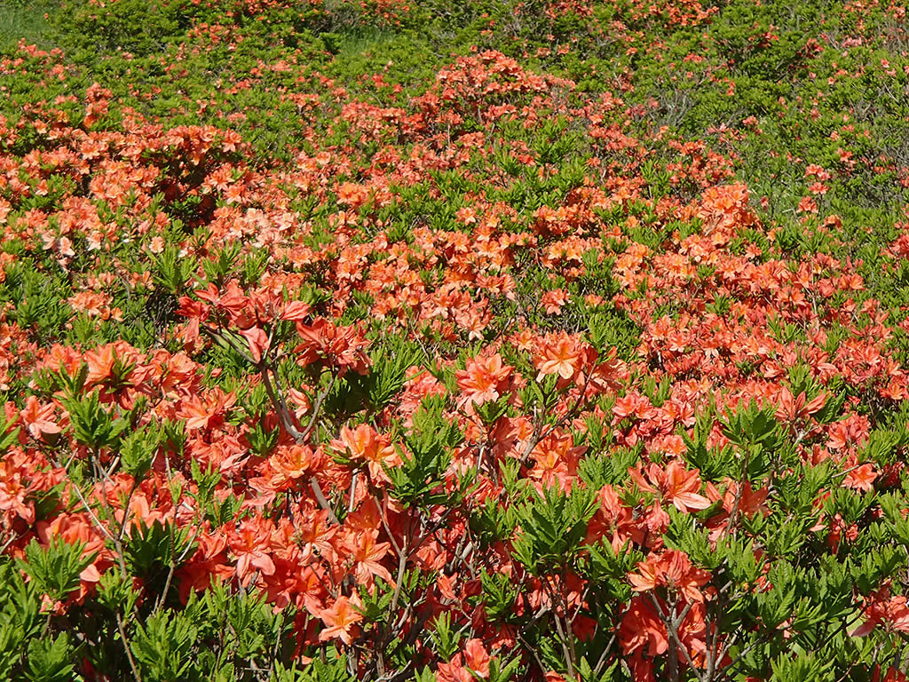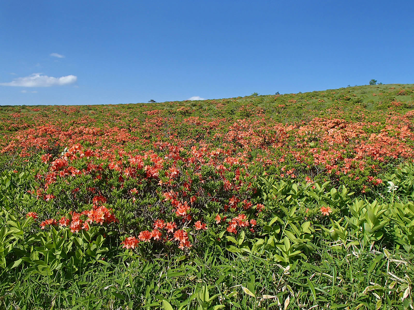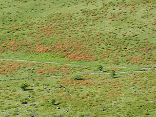 車山山頂に向かう登山道沿いのレンゲツツジも見頃になっています。斜面をオレンジ色に染めるほど密集はしていませんが、よく見るとかなり広範囲に分布しています。