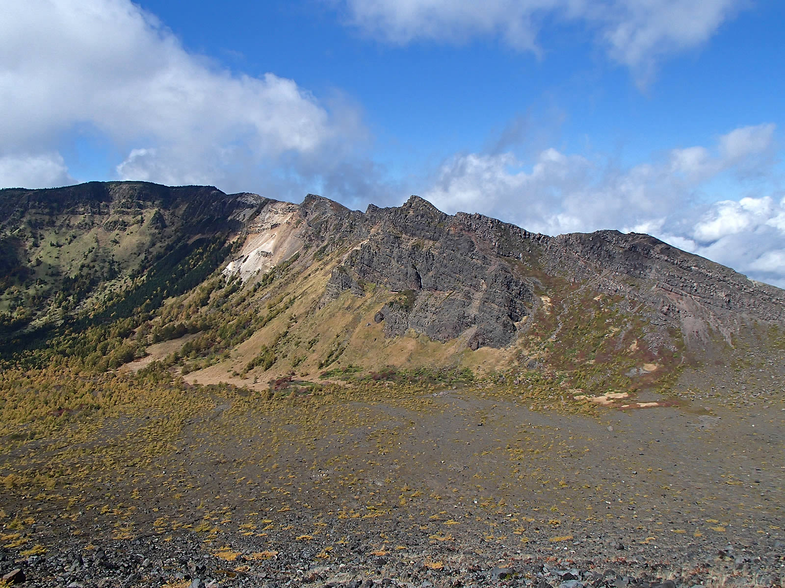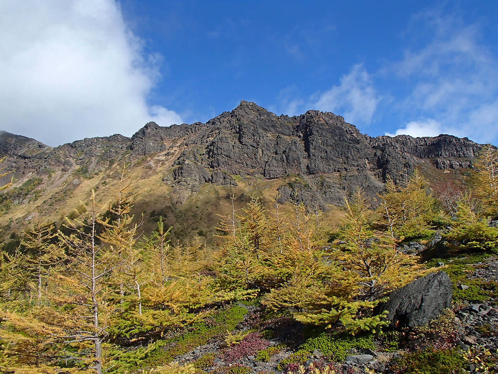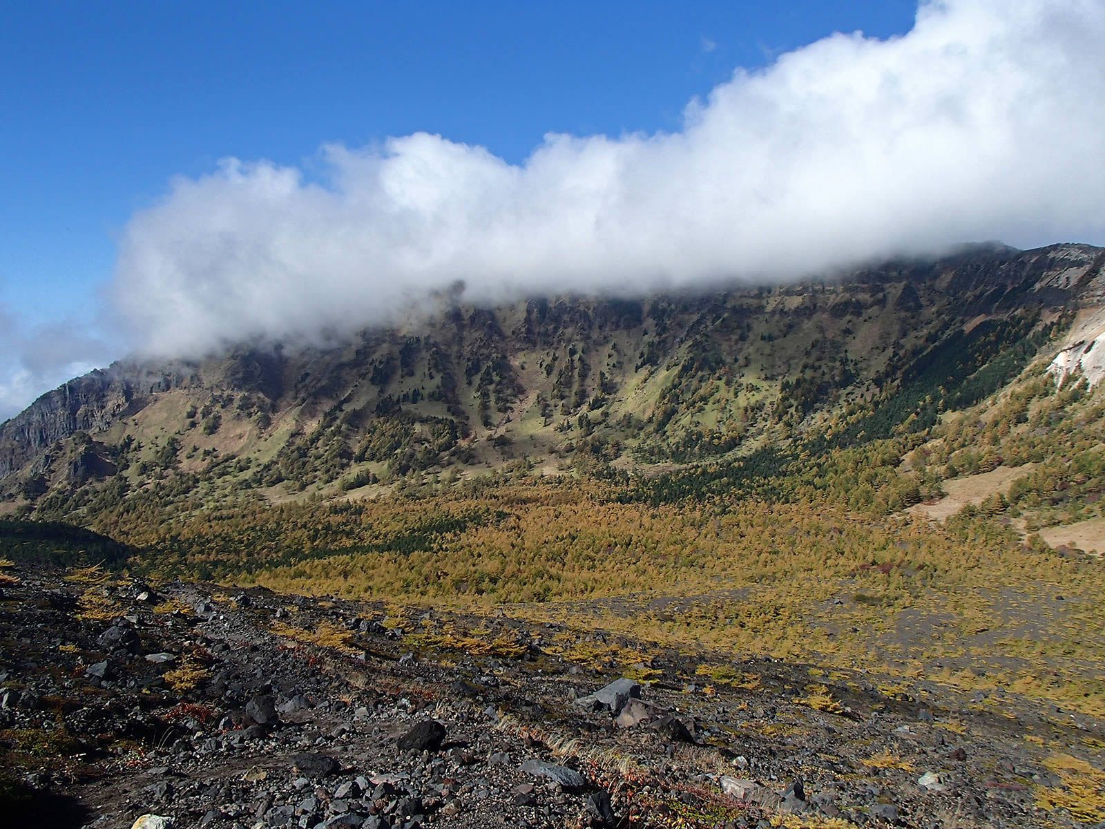 振り向くと稜線だけガスに覆われた黒斑山が見えていました。