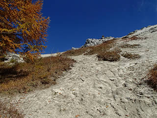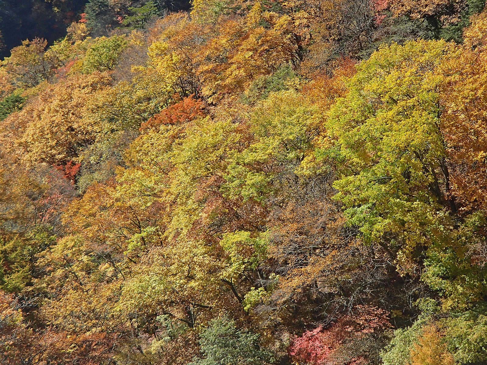 次の2枚はこれから登る斜面の紅葉をズームしたもの。下の方はまだ緑が多いですが、上の方は良い感じに色づいてきています。