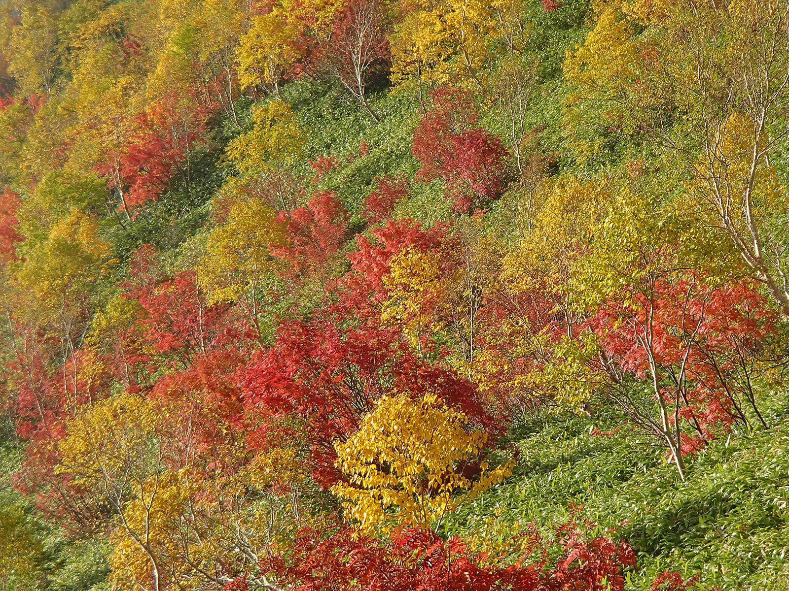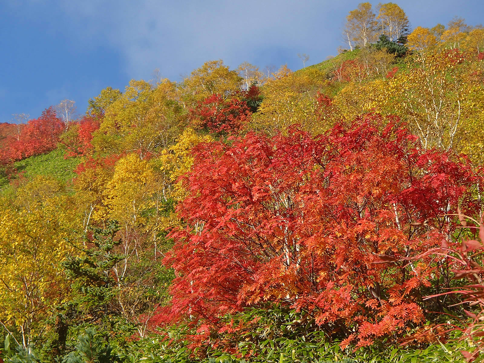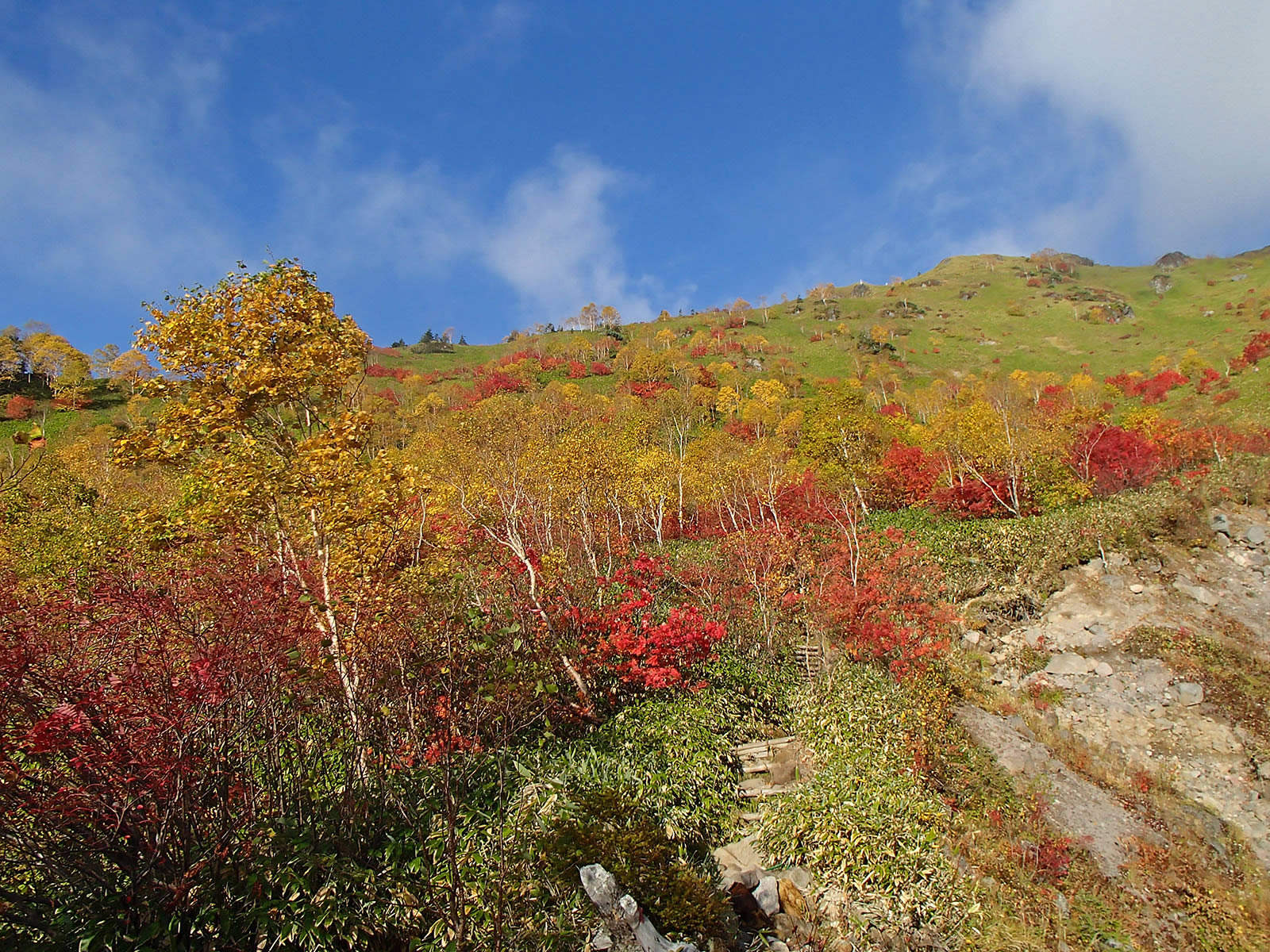 斜面をズーム。緑の笹原にダケカンバの黄色の紅葉、そしてナナカマドの赤の紅葉が点在し、青空の青色と合わせて原色オンパレードという感じでとても鮮やかできれいです。これが焼岳の紅葉の特徴です。