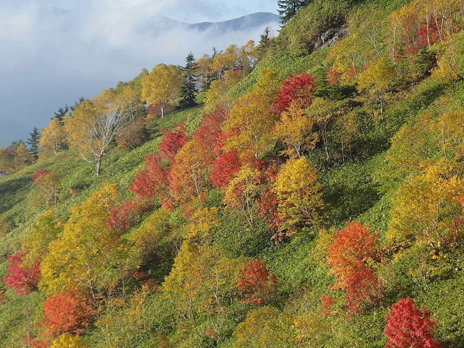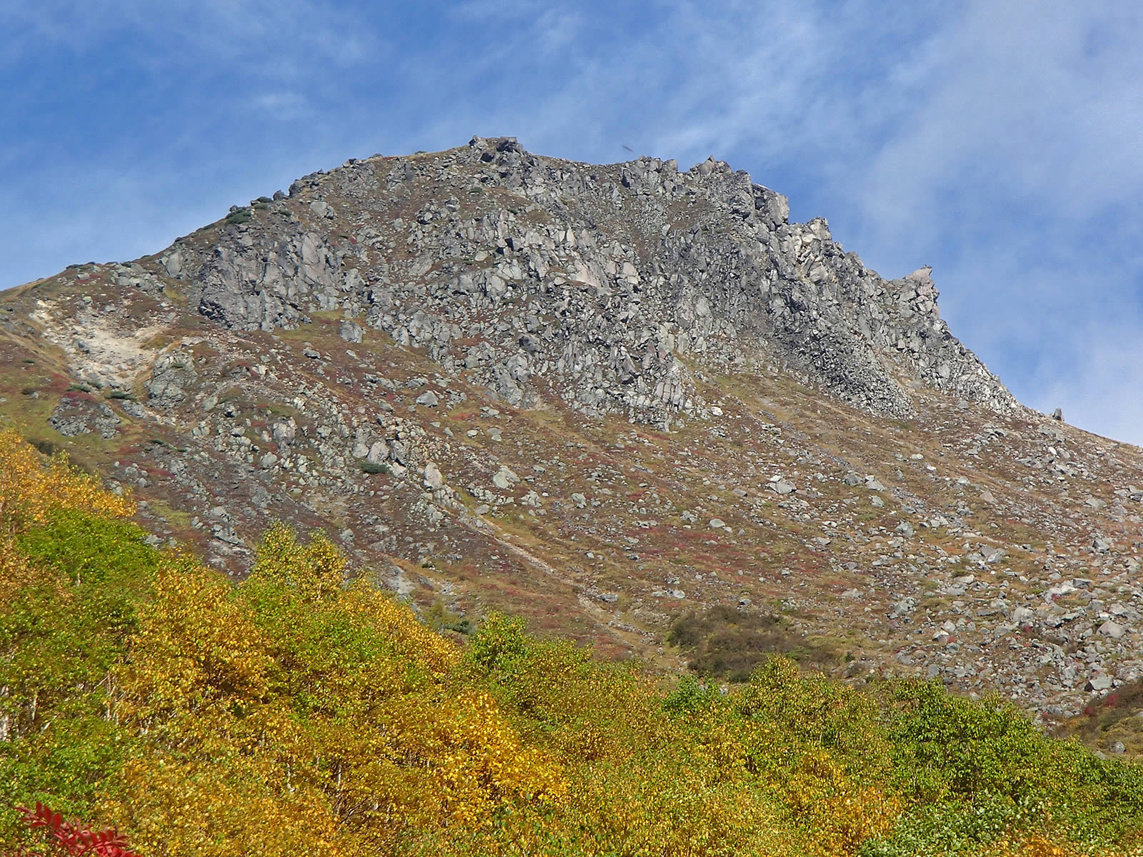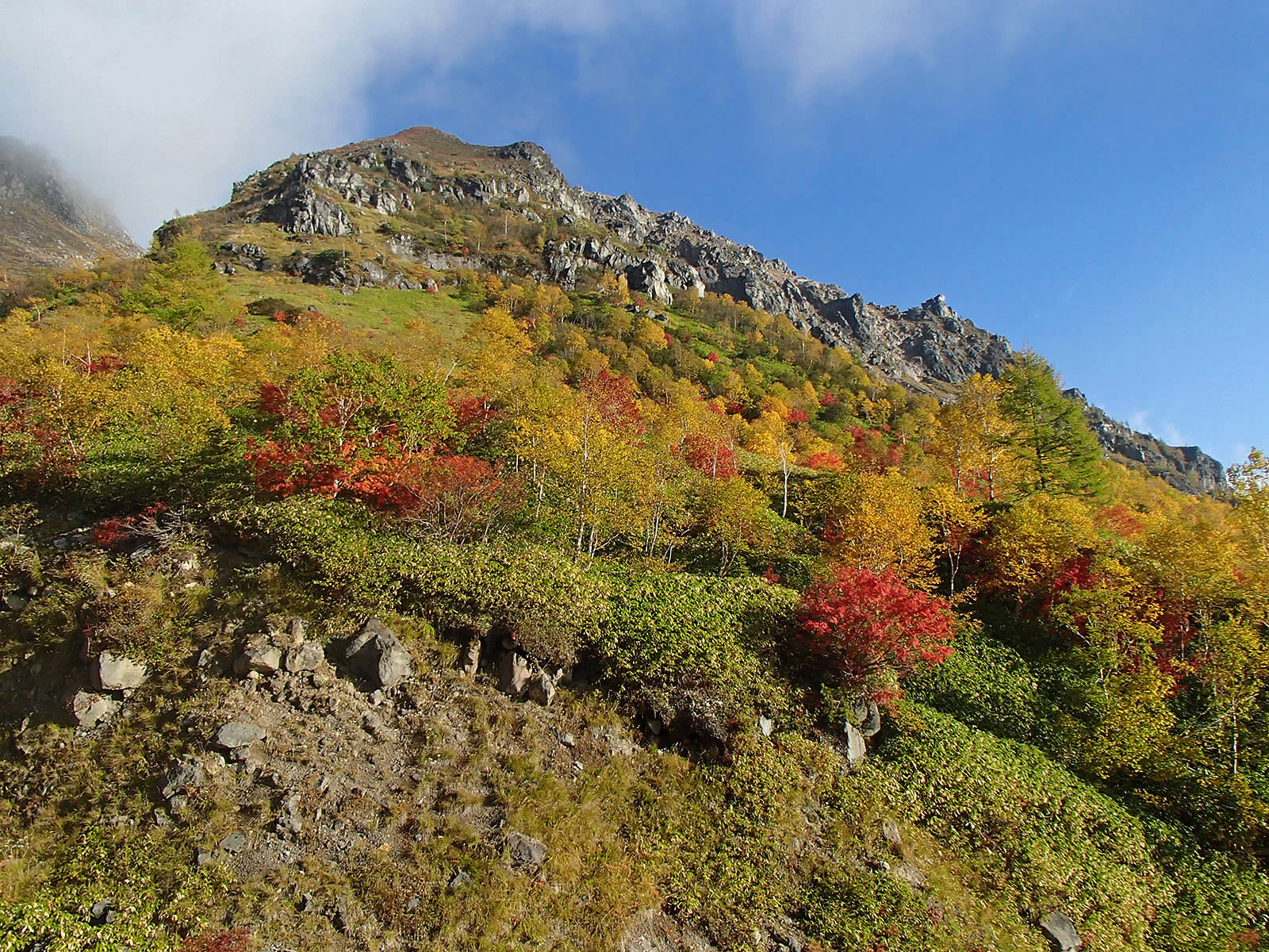 斜面をズーム。緑の笹原にダケカンバの黄色の紅葉、そしてナナカマドの赤の紅葉が点在し、青空の青色と合わせて原色オンパレードという感じでとても鮮やかできれいです。これが焼岳の紅葉の特徴です。