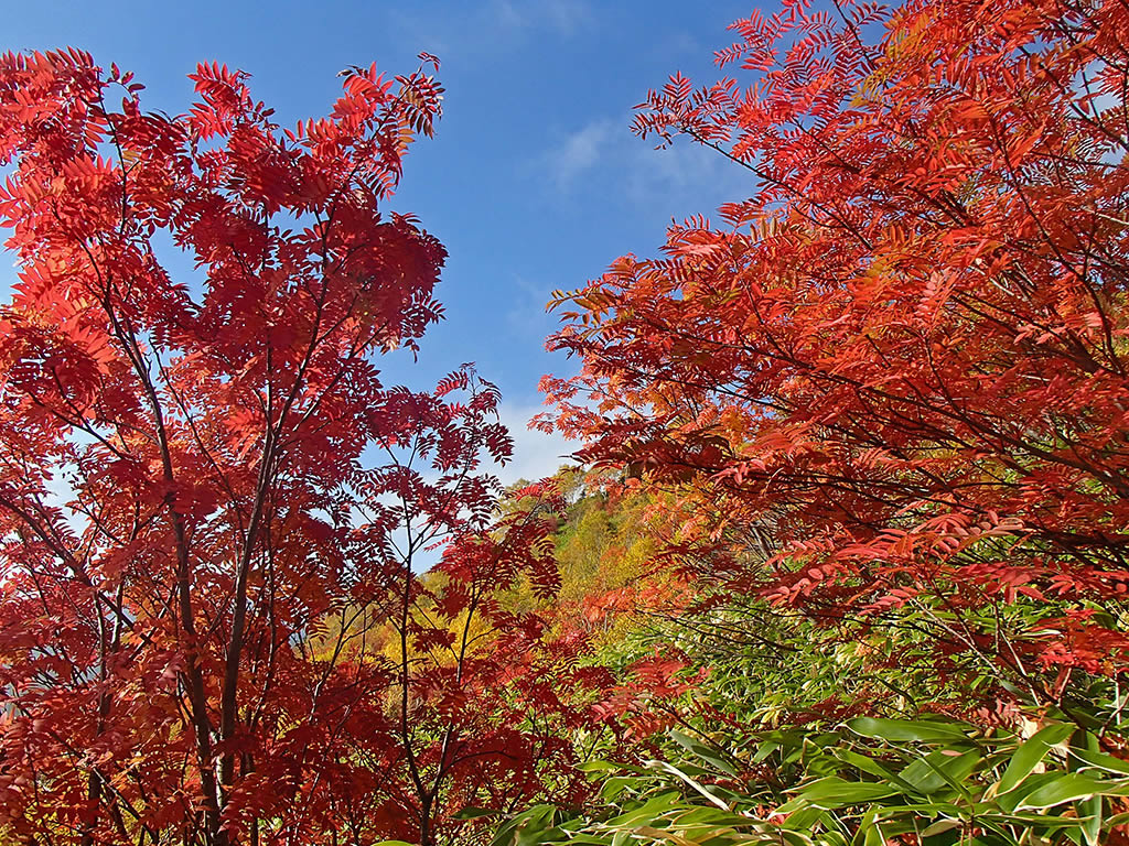 りんどう平が近づくと真っ赤なナナカマドの紅葉を目にするようになります。