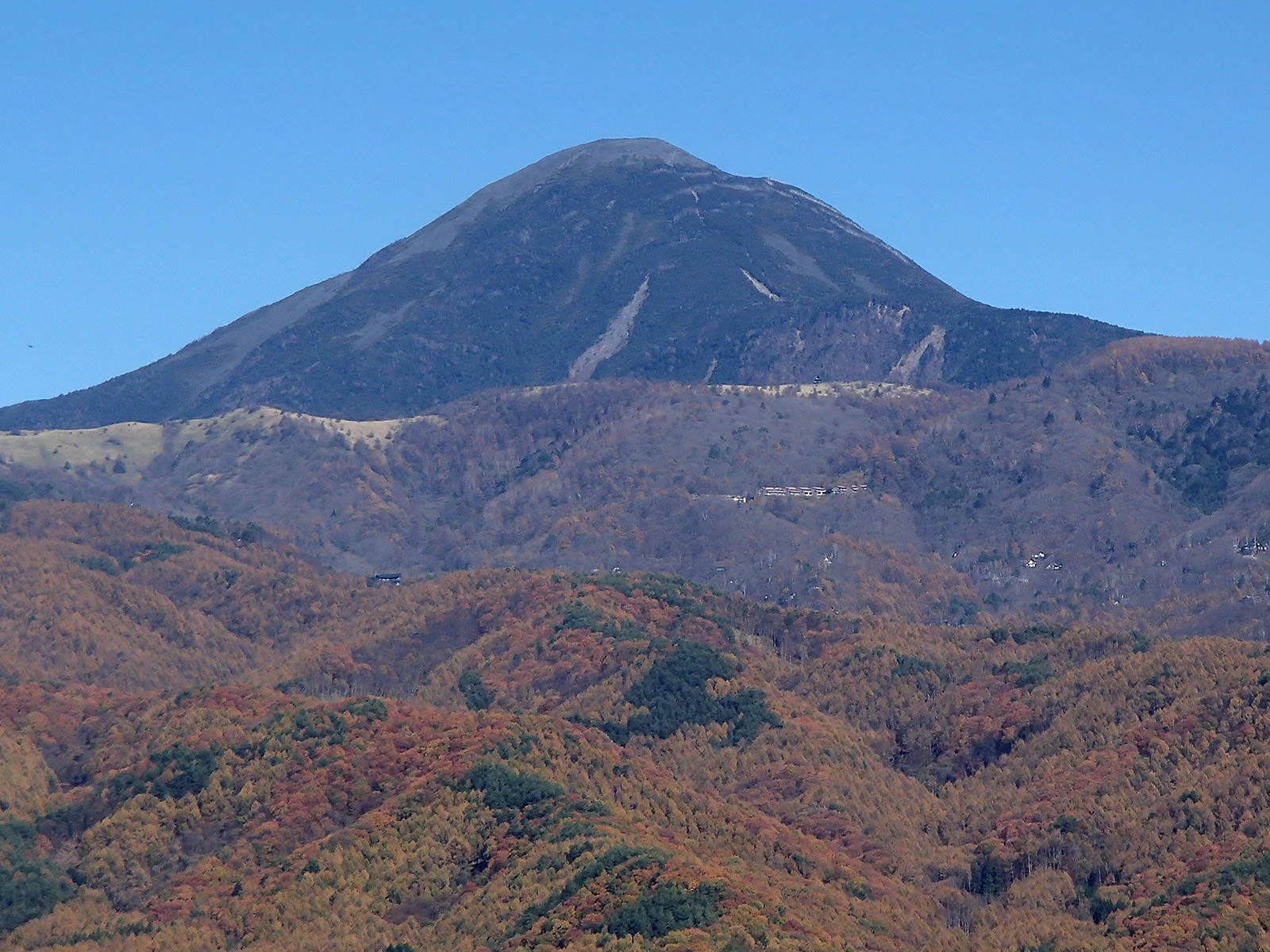 中山、横谷渓谷をズーム。横谷渓谷の紅葉も乙女の滝あたりまで降りてきているようです。