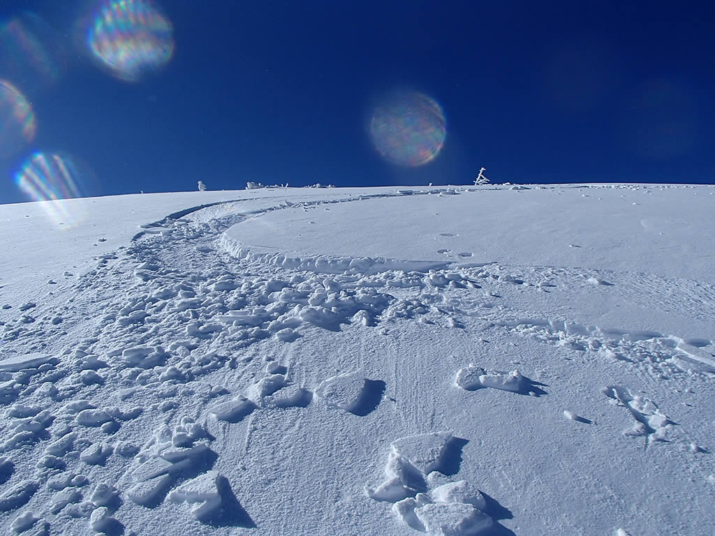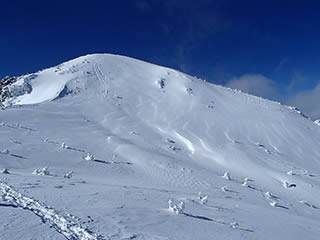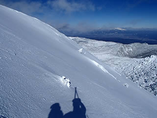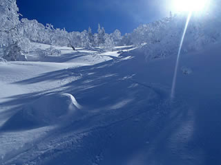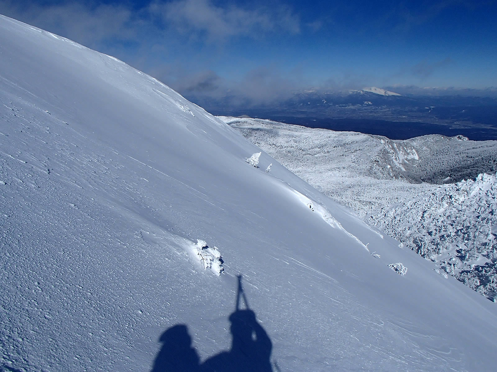 東側の急斜面にもパウダーが吹き溜まっているのが見えます。ただ斜度がきついので雪崩が心配です。