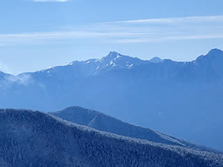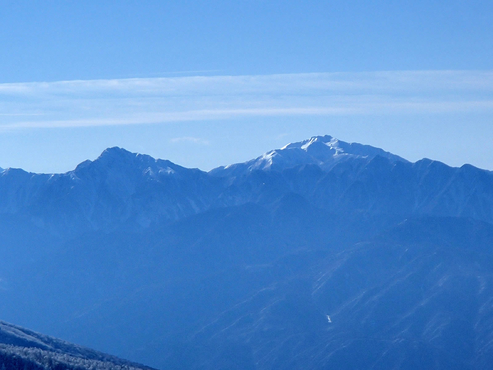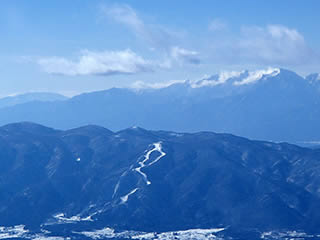 中央アルプス南部をズーム。手前は入笠山、富士見パノラマリゾートのスキー場。