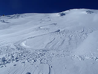 斜面の下の方は、強風パックされた上に飛ばされてきた新雪が10cmほどという状態でした。