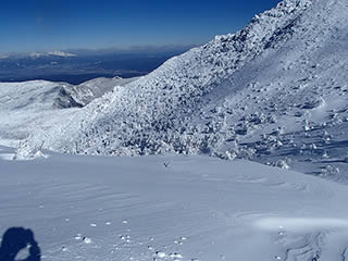 東天狗岳北面。くぼんだ地形に新雪がたっぷりと吹き溜まれば気持ちよい滑走フィールドになります。
