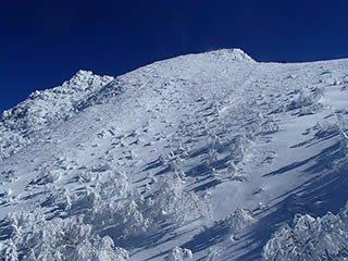 東天狗岳の北西斜面を見上げます。昨シーズンはこの斜面を滑り降りました。