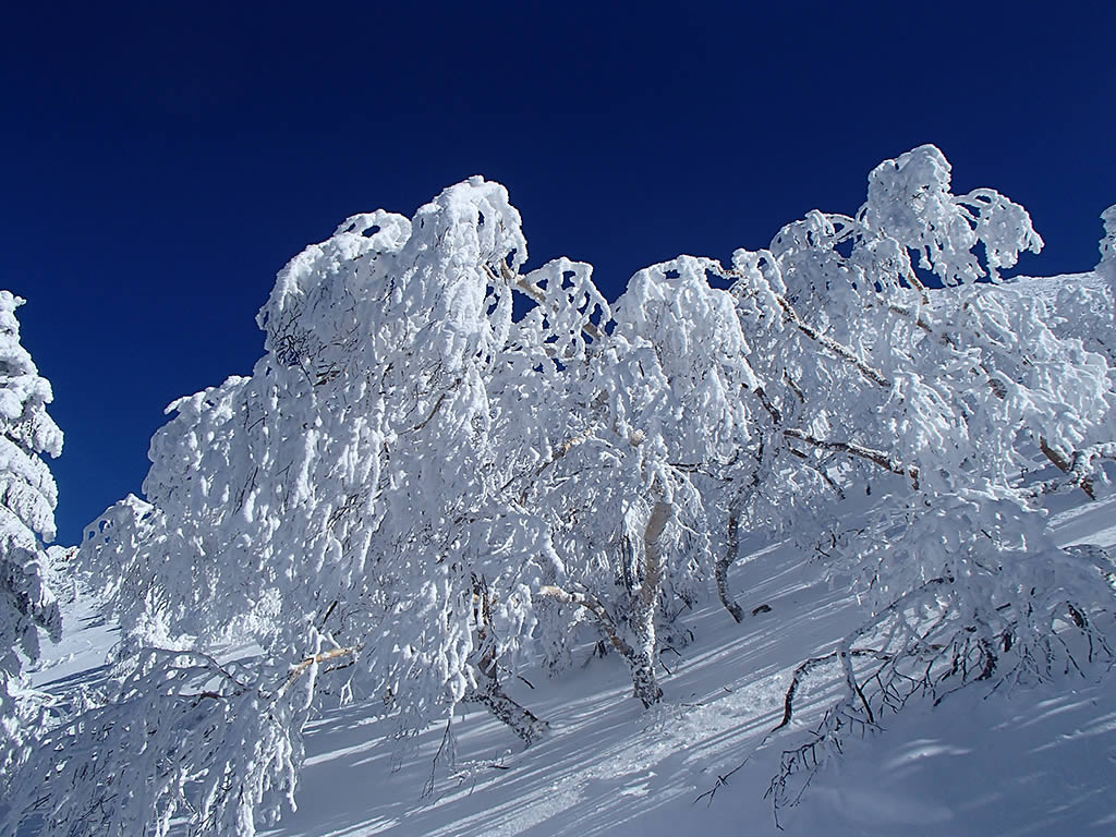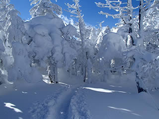 登るに従って周囲の雪はどんどんと増えていきます。3日前の湿った雪の影響か、雪を載せた木の枝が登山道上に垂れ下がっている部分が多数あり、そのたびにお辞儀して通過しなくてはならず、かなり疲れました。シールで登ればその苦労は無いのですが、ただ逆に狭いクランク状の部分は板を外さなくてはならず、いつも通り山頂までスキーはザックに付けたまま登りました。