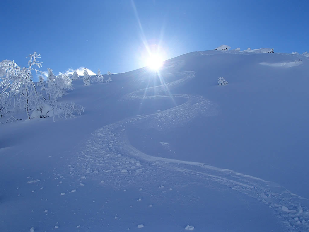 少し下ると急に雪は柔らかくなります(^^)。表面は風でパックされていますが、ターンすれば30cmほどは削れてくれます。