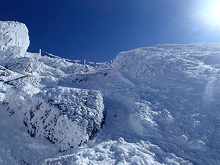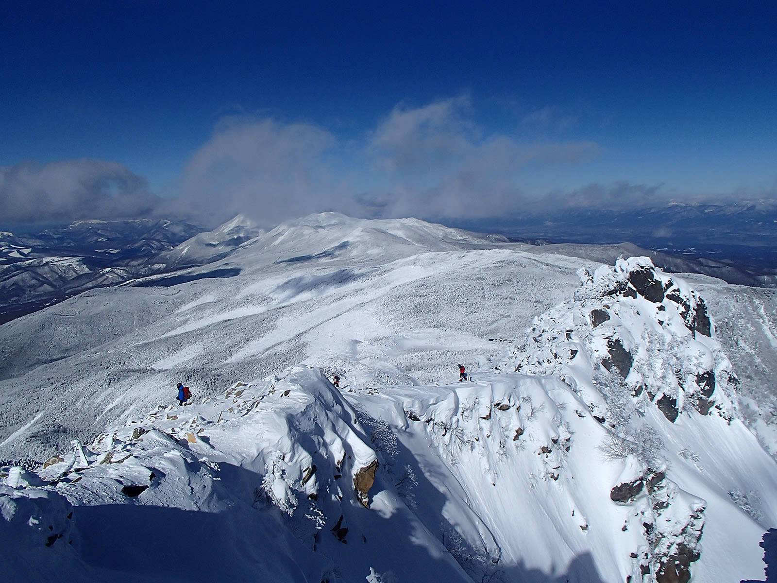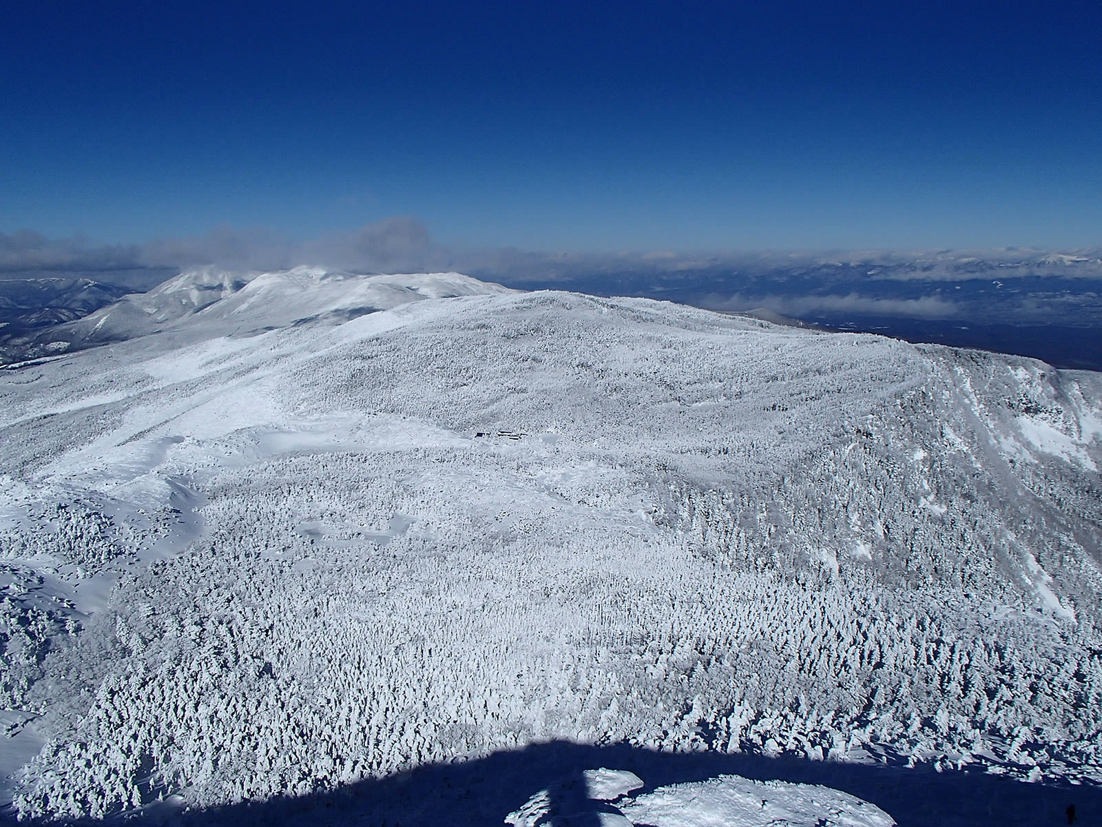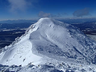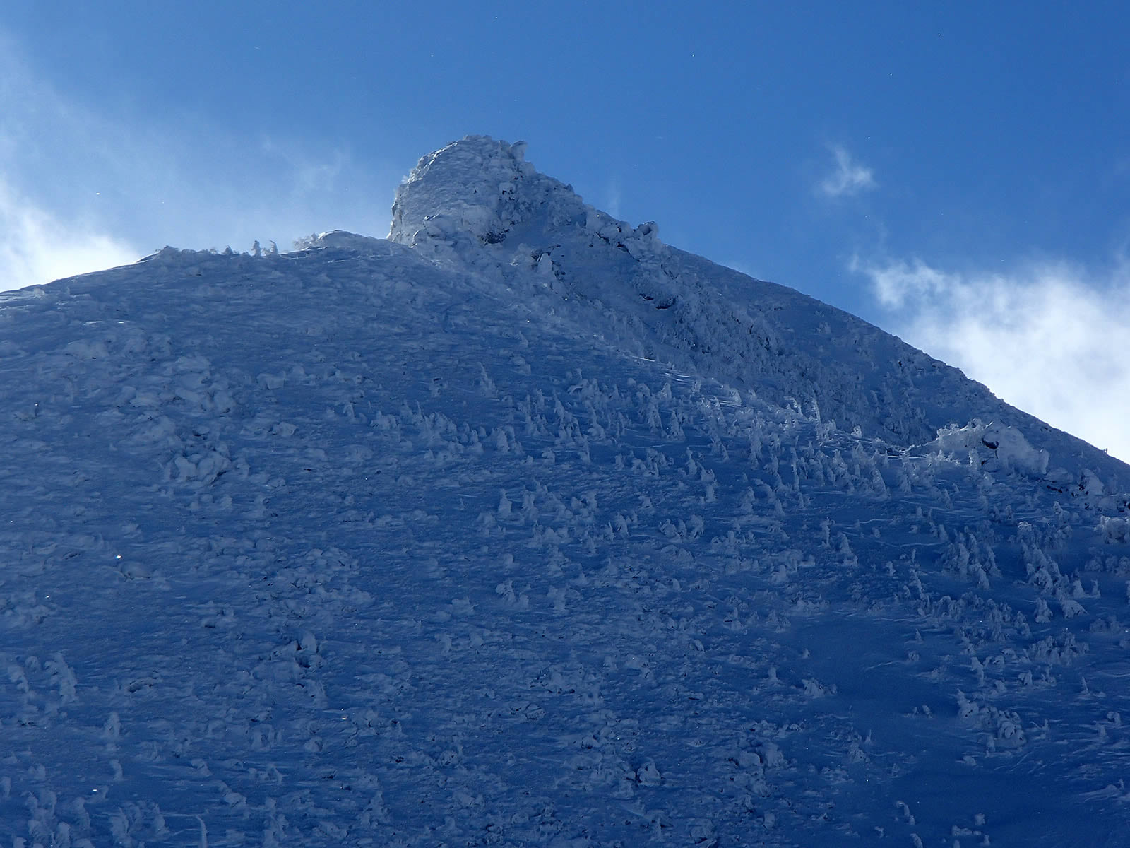 西天狗岳山頂をズーム。積雪が多く、滑るには全く問題ありません。例年では1月中旬頃の積雪量ではないでしょうか。