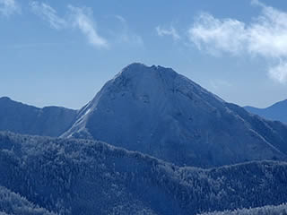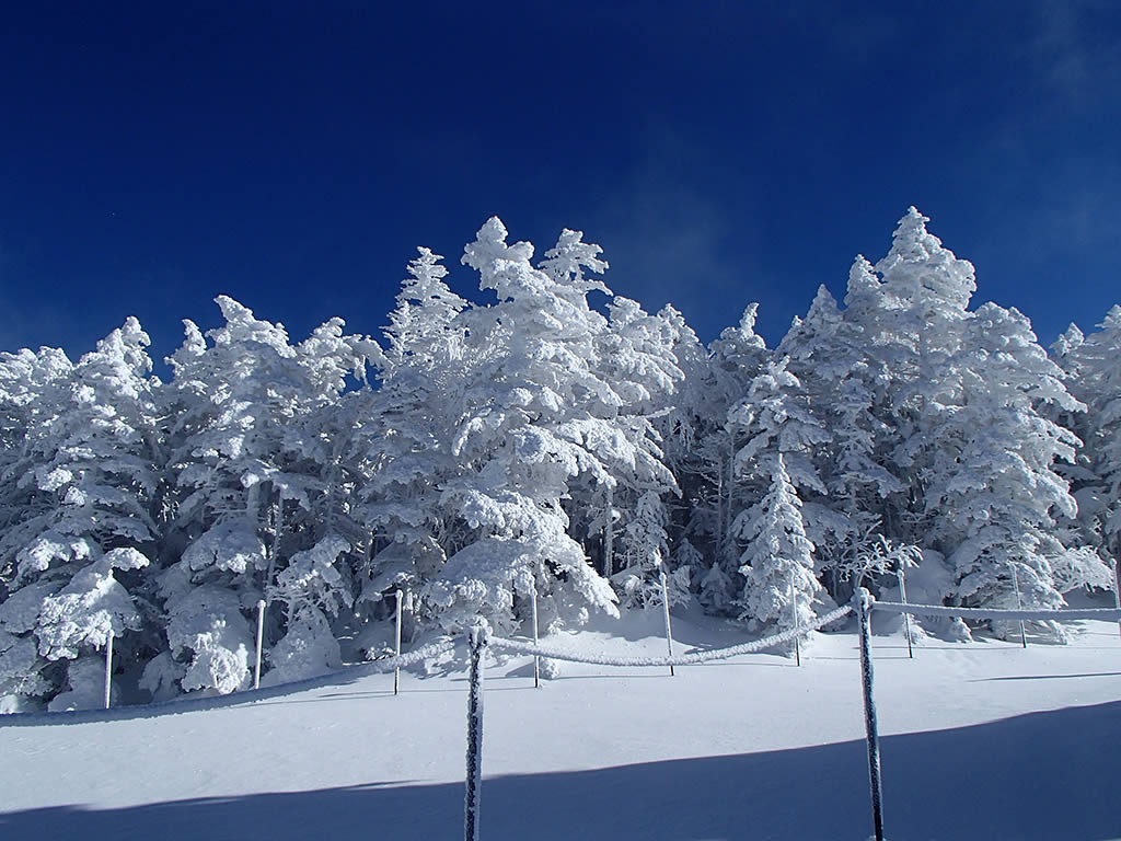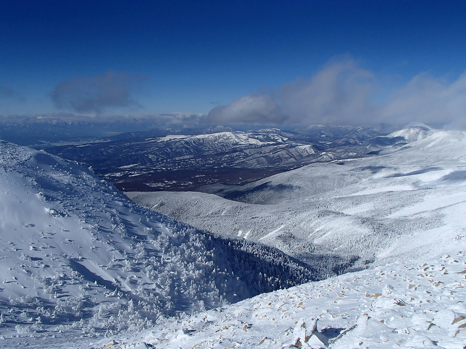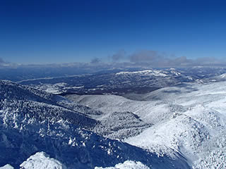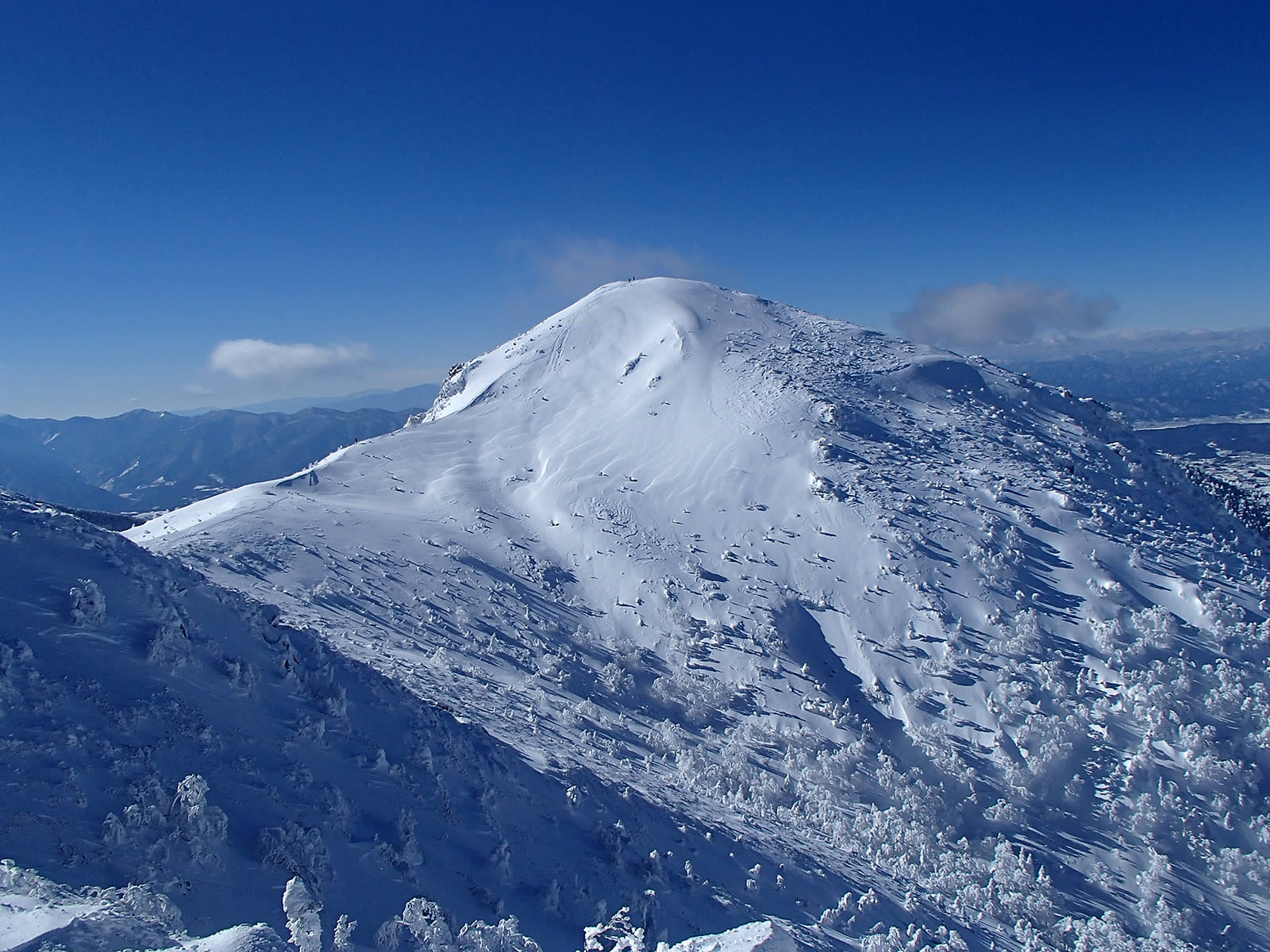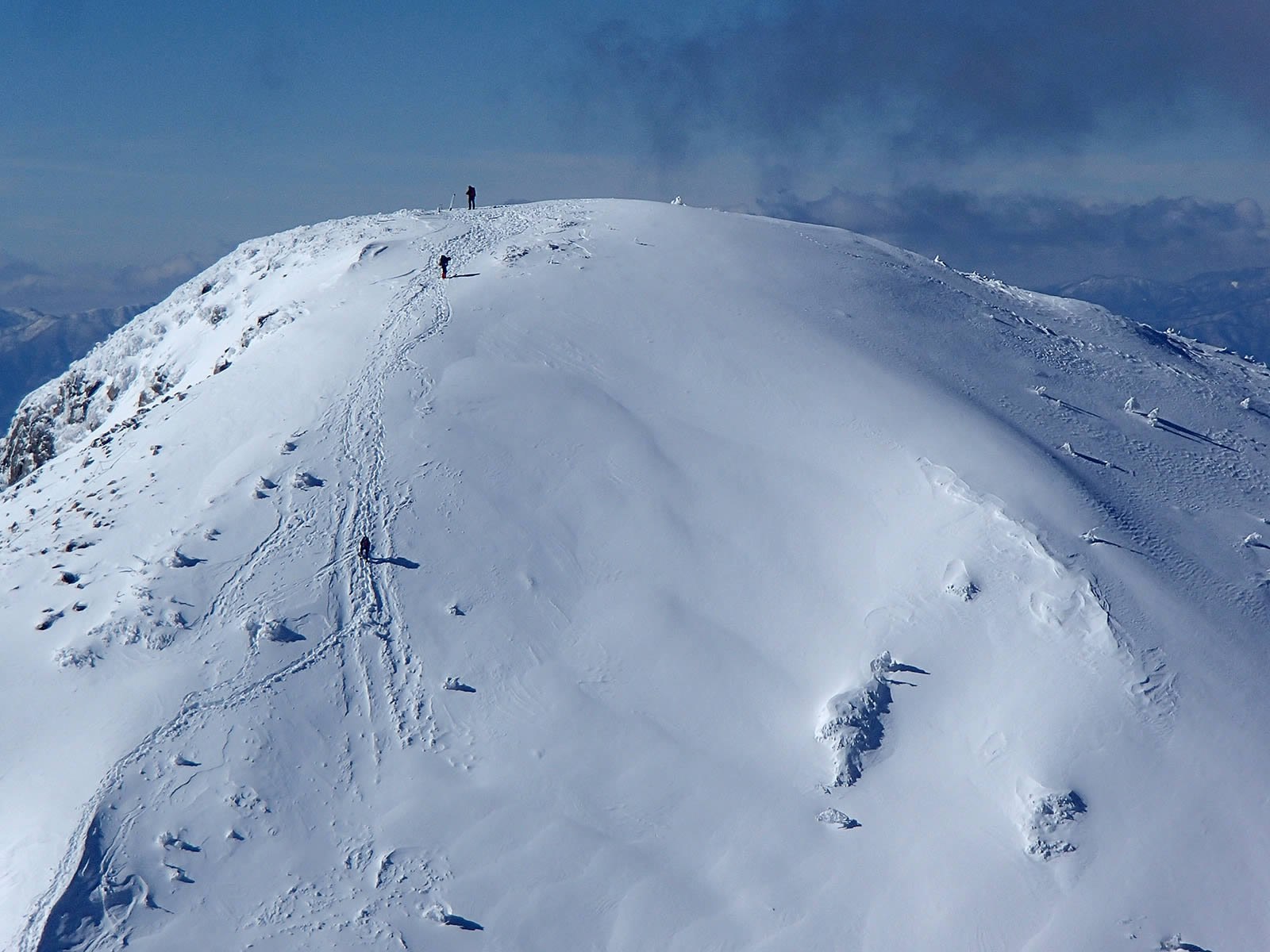 西天狗岳山頂をズーム。積雪が多く、滑るには全く問題ありません。例年では1月中旬頃の積雪量ではないでしょうか。