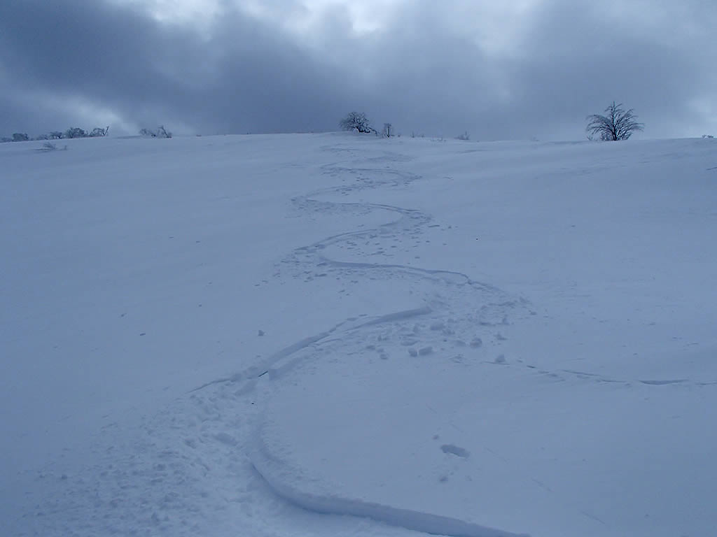 自分のシュプールをたどって登り返し、リフト終点手前で西側の斜面に進みます。実はこちら側の斜面の方がパウダーがたまりやすく、かつ斜度があって気持ちよいパウダー滑降を楽しめるのです。