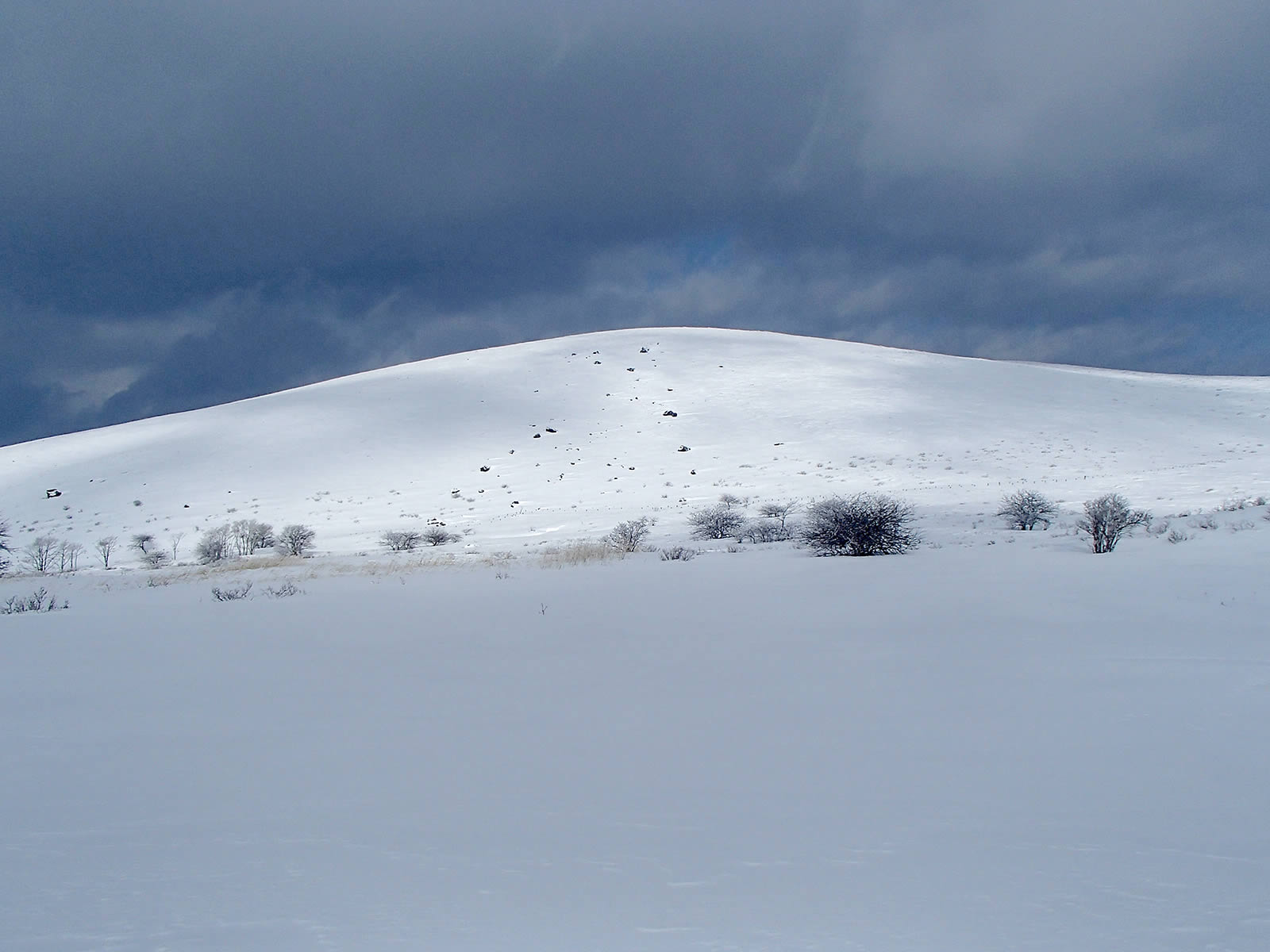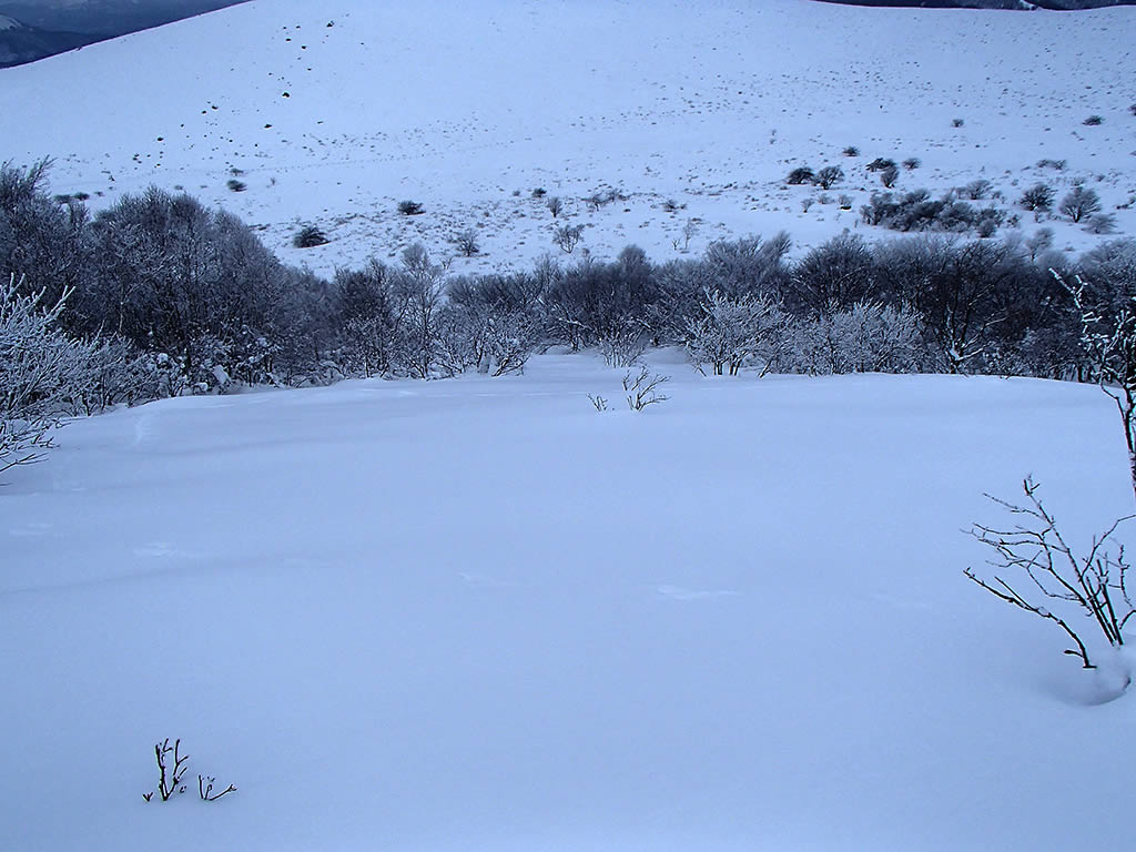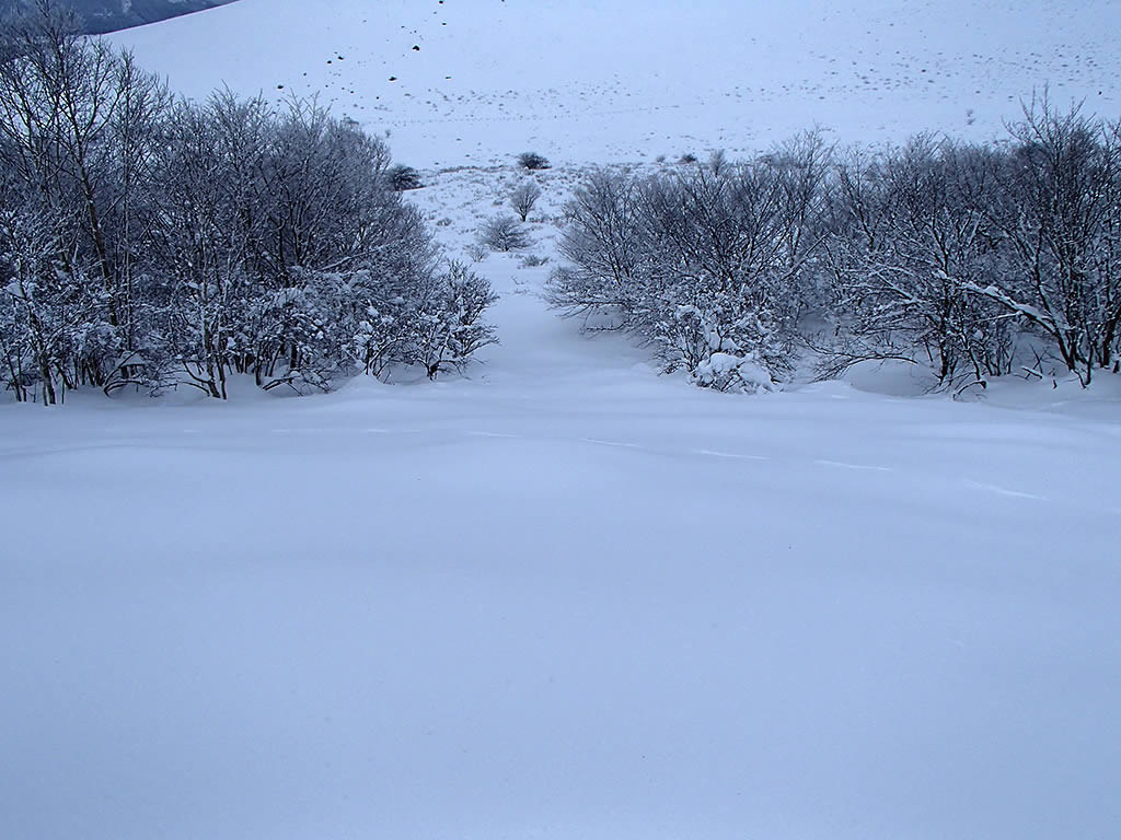 いつも滑る西側の広い斜面でなく、今回は北面真ん中の少し急な斜面を滑ってみます。藪は埋まり、滑るには問題ありません。