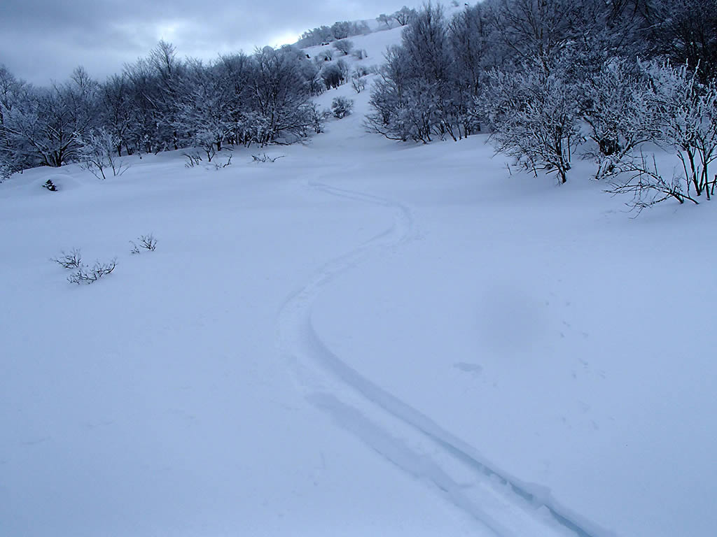 こちらの斜面は風による影響が少なく、全体的にクリーミーなパウダーという感じでした。藪も多少出ていますが、滑るにはほぼ問題ありません。
