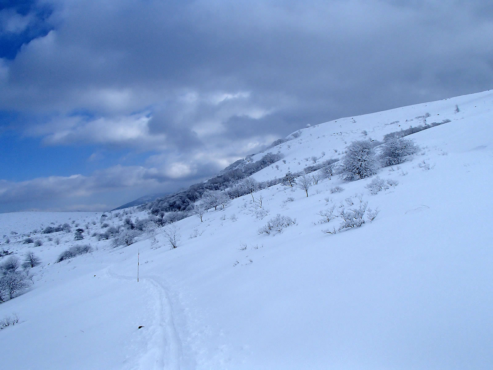 こちらも積雪が多く、斜面の藪、登山道沿いの杭はほぼ埋まっています。