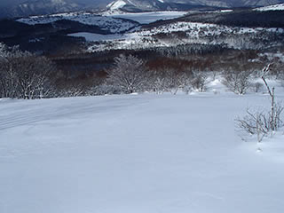 直登ルートへの分岐の少し手前から北側斜面に入って滑り始めます。