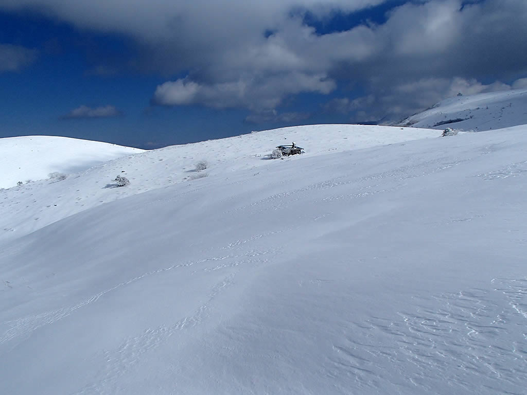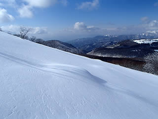 車山北面をズーム。上部斜面に私のシュプールも少し見えていますが、車山BCの醍醐味はやはりこの北面滑走だと思います。最後は車山肩まで登り返しが必要になりますが、車山西面、北西面から飛ばされた新雪が吹き溜まりますので、ディープパウダーが楽しめる斜面でもあります。ただしルートによっては雪崩等にも注意が必要となりますが。