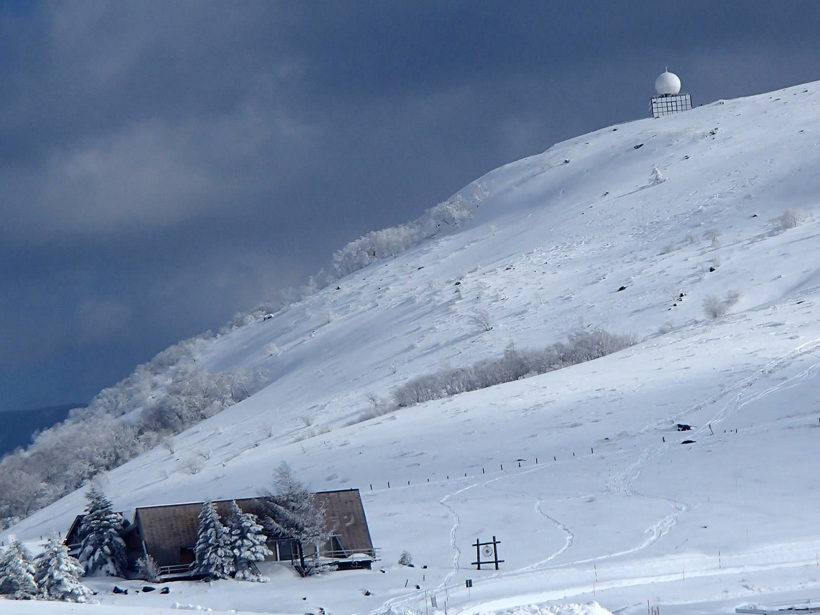 車山北西面をズーム。山頂直登ルートが見えます。スキーヤーが二人滑り降りているのも見えます。