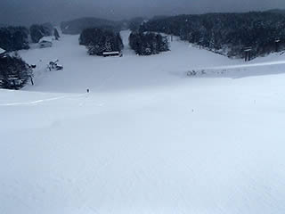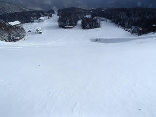食事後、もう一度登り返してかもしかゲレンデを滑って見ることにしましたが、たださすがに疲れがだんだんと出てきて、登り切った頃には両足ともほとんど売り切れ状態となってしまいました(^^;。滑り始めてすぐに両足の太ももの前の部分がけいれんしてしまい、途中でゆっくりと休みつつ滑り降りていきました。