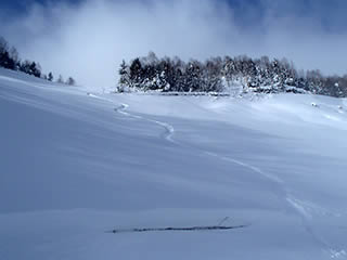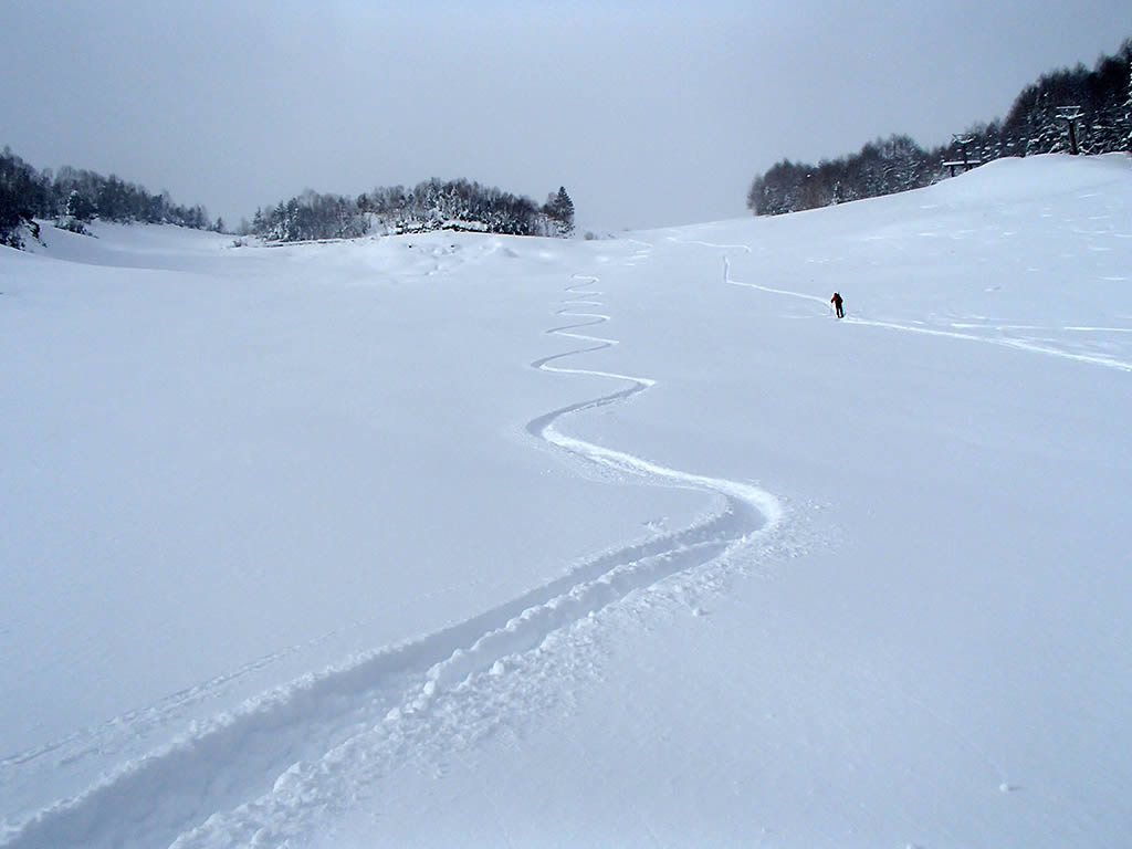 こちらの斜面はおそらく前日と思われる沢山のシュプールがうっすらと残っていて、そのシュプールの部分は雪が少し堅いため、バランスを崩さないように注意して滑りました。