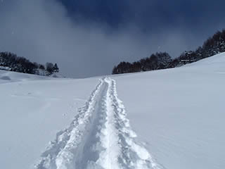 いつもはこの先を右の斜面に進むのですが、トレースは左の狭い斜面を登って行っていましたので、そちらに進みます。