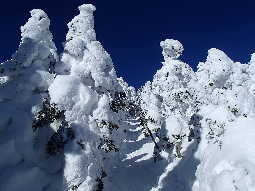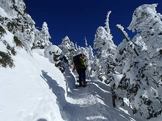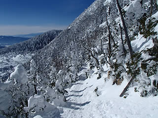 ここから北横岳南峰までは急登が続きますので、アイゼン等の滑り止めが必要です。