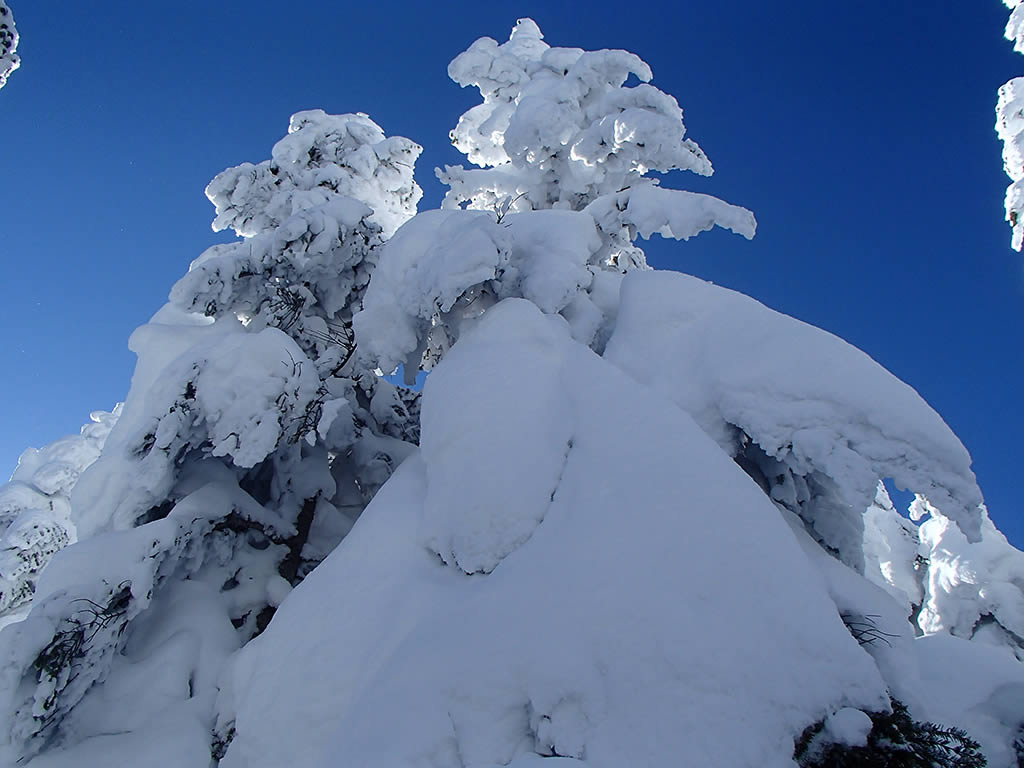 アイゼンは北横岳ヒュッテで付けることにしてつぼ足で歩き始めます。駅のすぐ前の大きな樹氷が見事です。