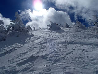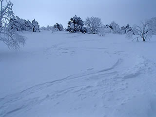 斜面上部でオープンバーンが広くなると風の影響を受けて柔らかい雪はあっても10cmほどになります。