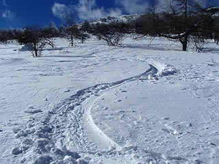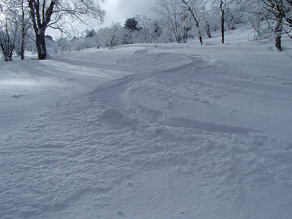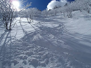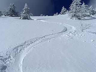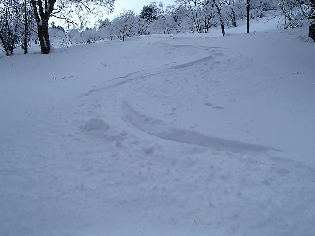 多分今回滑った中で一番雪質が良かった辺り。ターンで削った雪の状態を見ると雪質が一番良く分かりますね。ここは本当にさらさらでした(^^)。