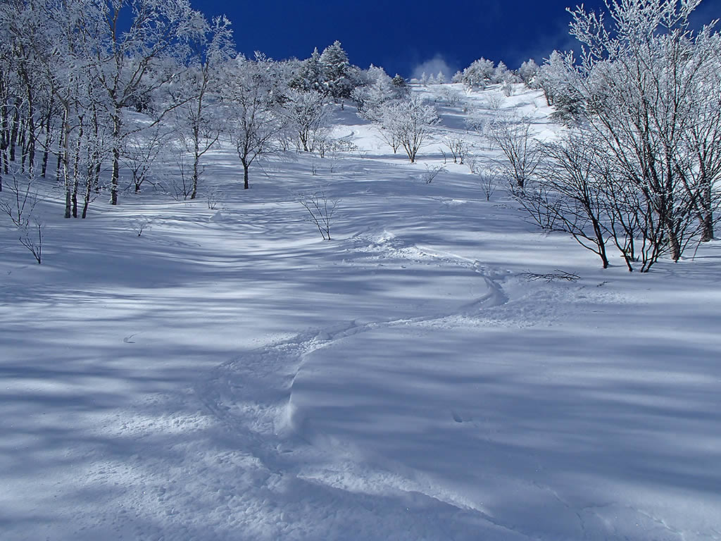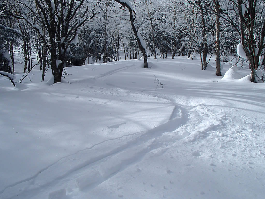 高い木が増えてきたこの辺りから風の影響が少なくなり、やっとさらさらディープパウダーと呼べる斜面になりました。