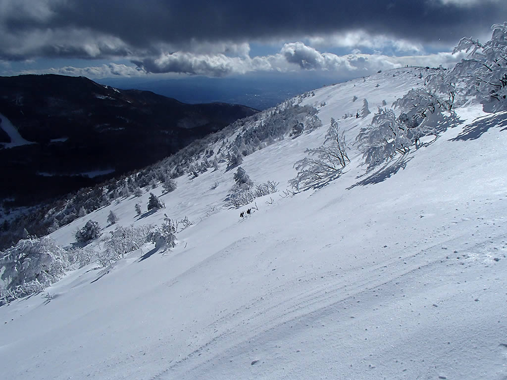 湯の丸山北峰東面の様子。笹は完全に埋まり、滑走には問題無い状態です。雪が少ない時期だと笹を踏み抜いて苦労します。