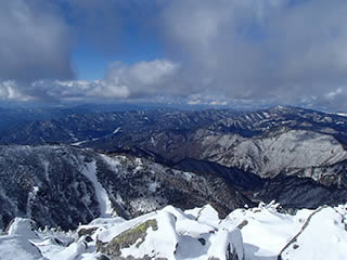 西側も青空が見えるようになってきました。ただし北アルプスは雪雲に覆われて見えませんでした。頸城山塊は麓が何とかという感じでした。