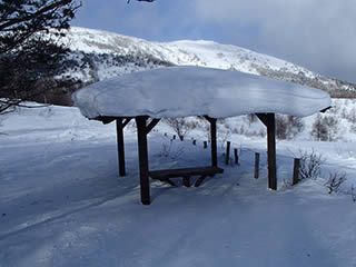 途中にある東屋(休憩所)の積雪はこれくらい。