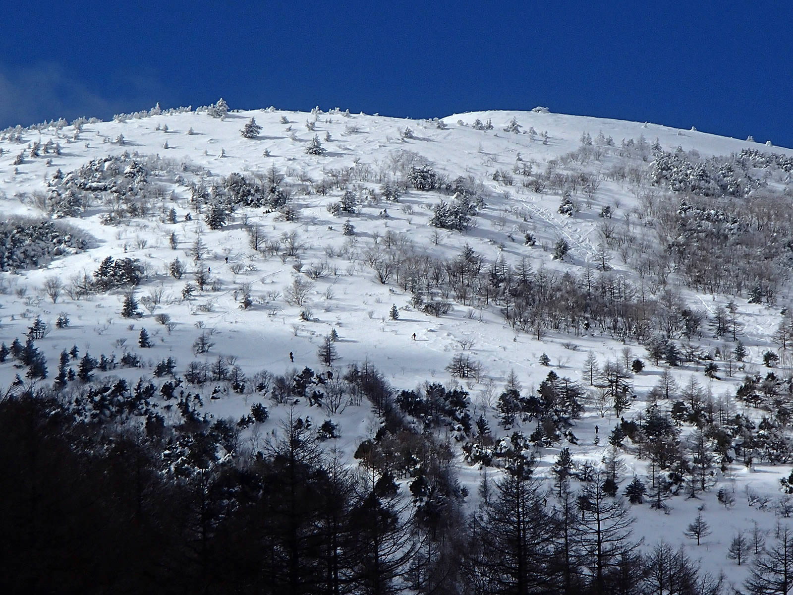 湯の丸山から烏帽子岳に登る稜線をズーム。いつかあの斜面を滑るのが一つの課題です。