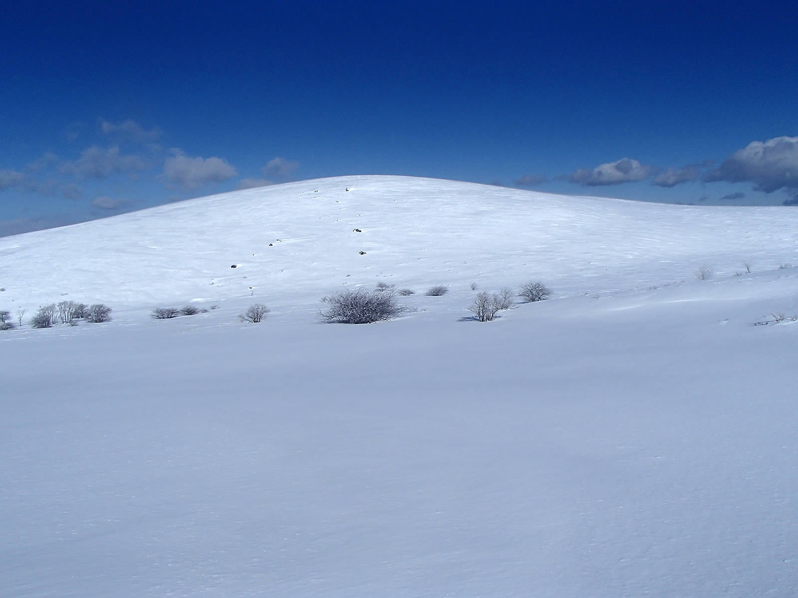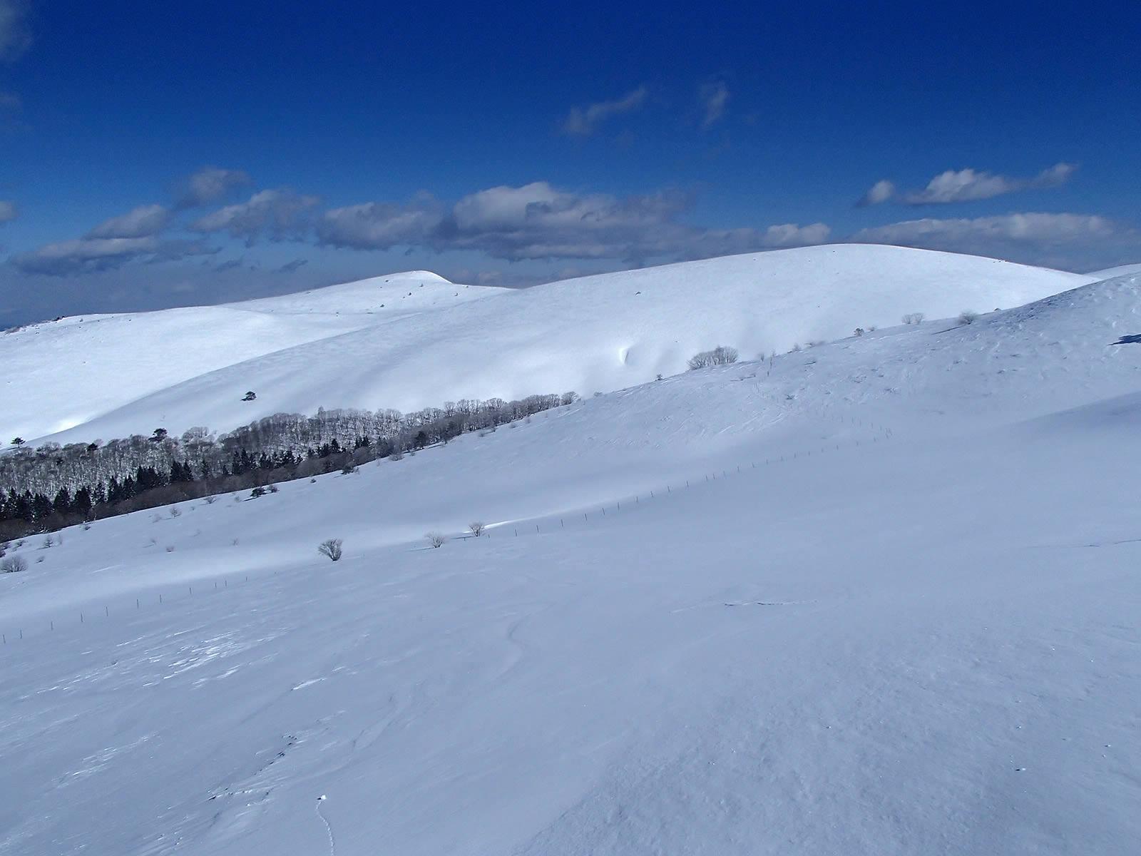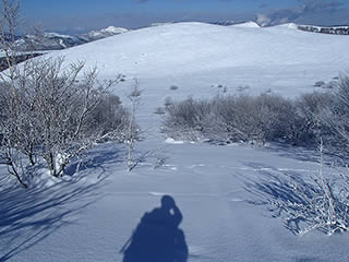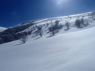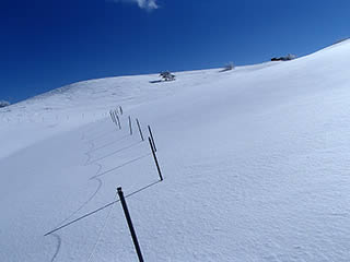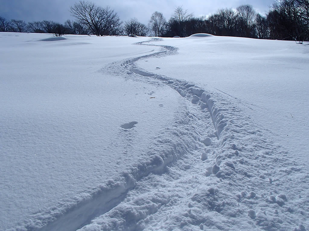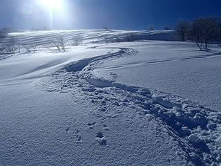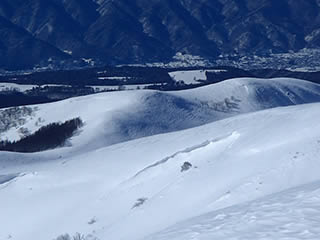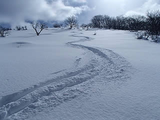 稜線近くはかりかりか、新雪が残っていてもパックスノーでシュプールはほとんど残りません。