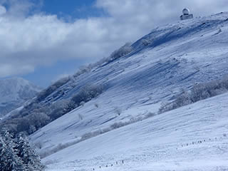 ビーナスの丘の向こうの沢渡スキー場跡の斜面に向かいます。車山肩から上が強風でかりかりでも、沢渡スキー場跡の斜面は風の影響がほとんど無いことが多いので、今回も楽しみです。