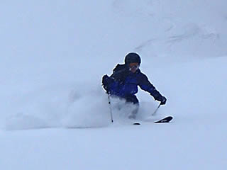 友人は樹林帯の脇を滑り降りていきました。もっさりパウダーですが、さすがにこれだけ斜度があるとターンの度にスプレーが舞い上がります(^^)。