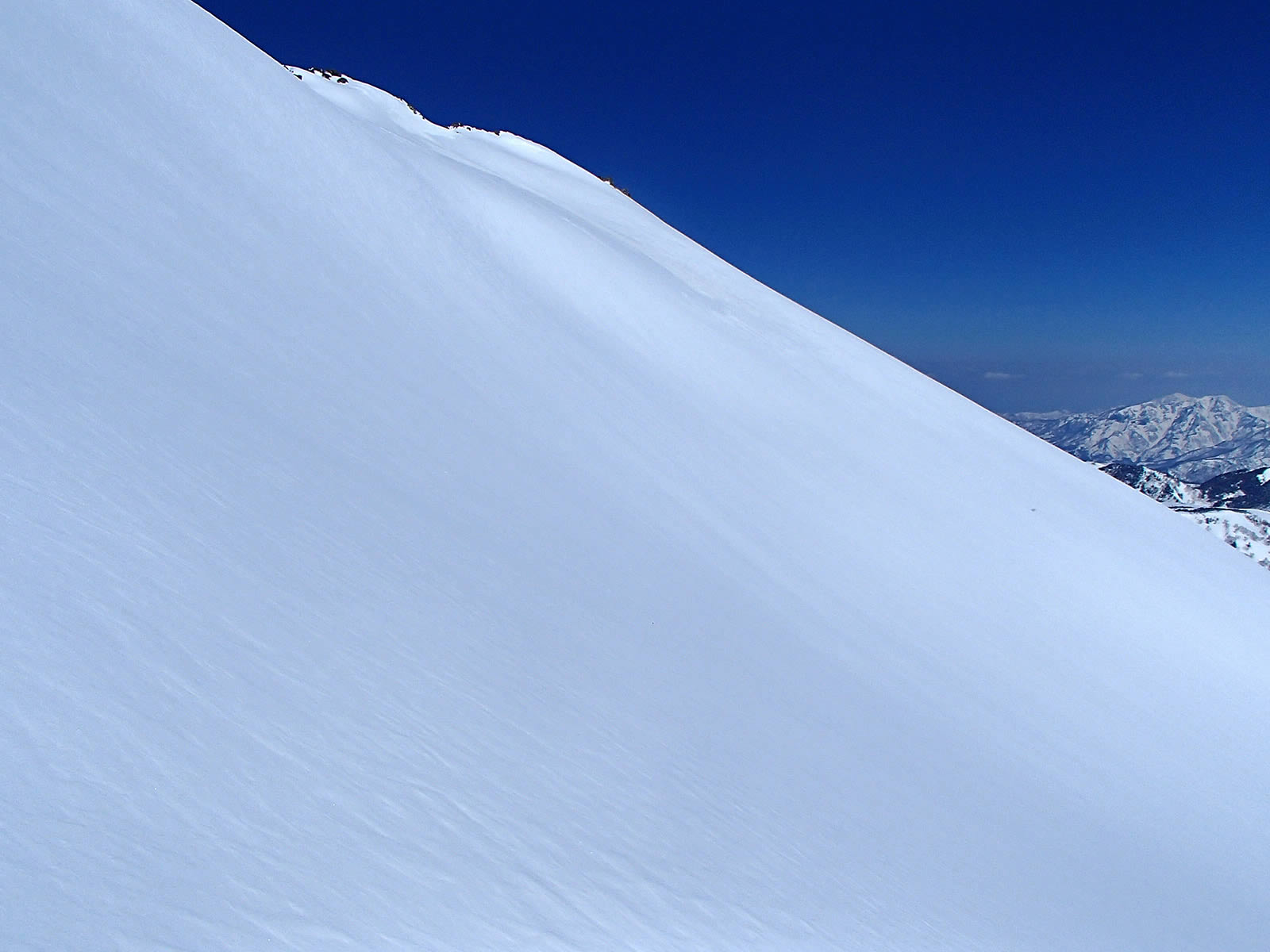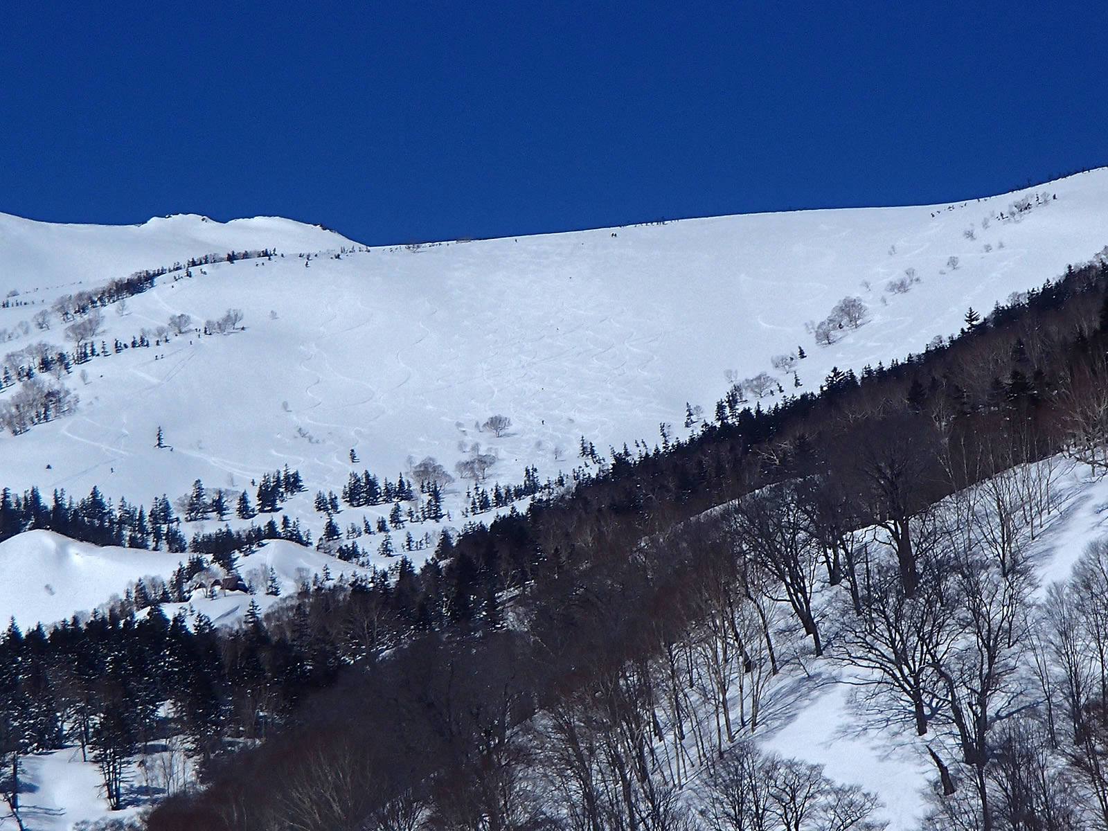 斜面上部などで強風の影響が見て取れます。また上部には吹き溜まりもあり、雪の状態によっては要注意です。実際に過去には、斜面を見上げている私の目の前で雪崩れたこともあります。