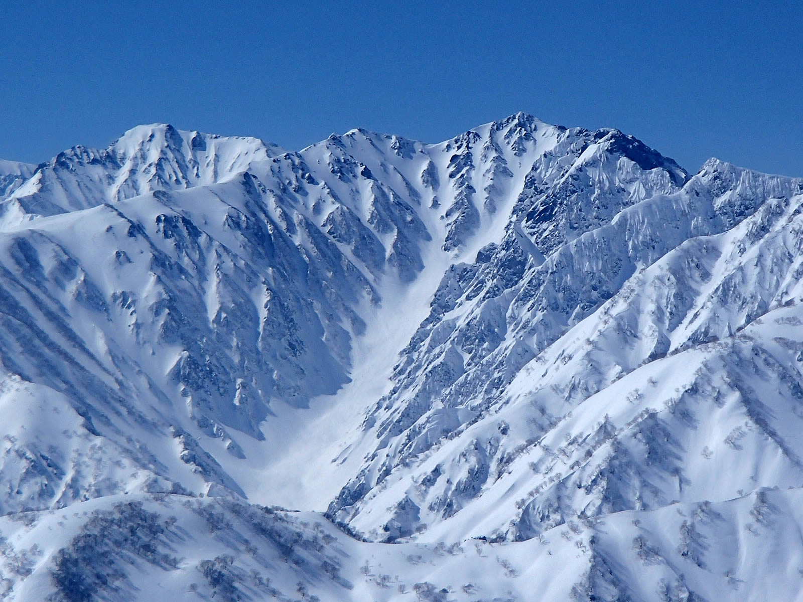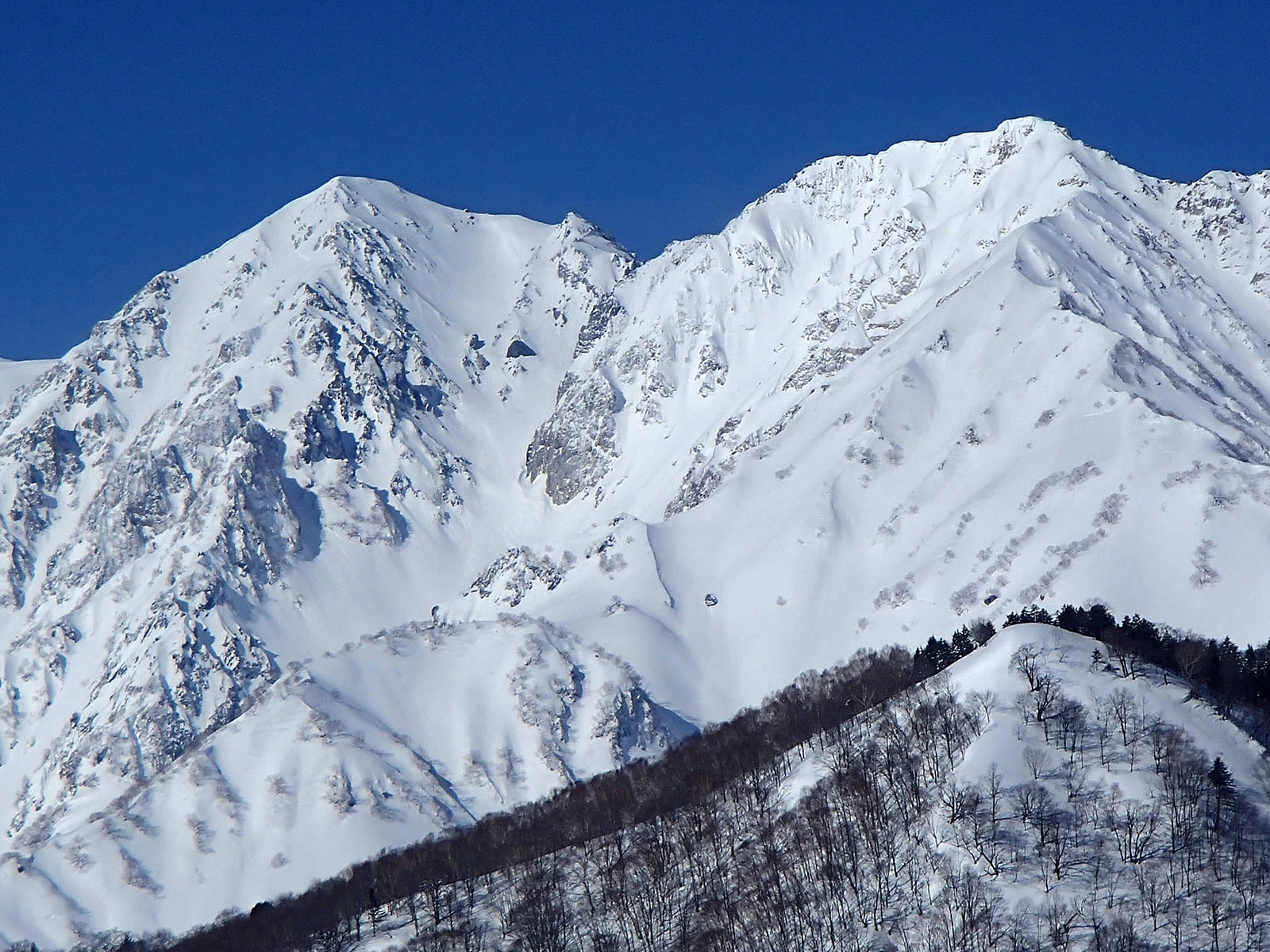 五竜岳、鹿島槍をズーム。八方尾根の無名沢も雪の状態は良さそうです。なお私がいつも滑っているラインは無名沢の一番左側の樹林帯沿いのコースです。