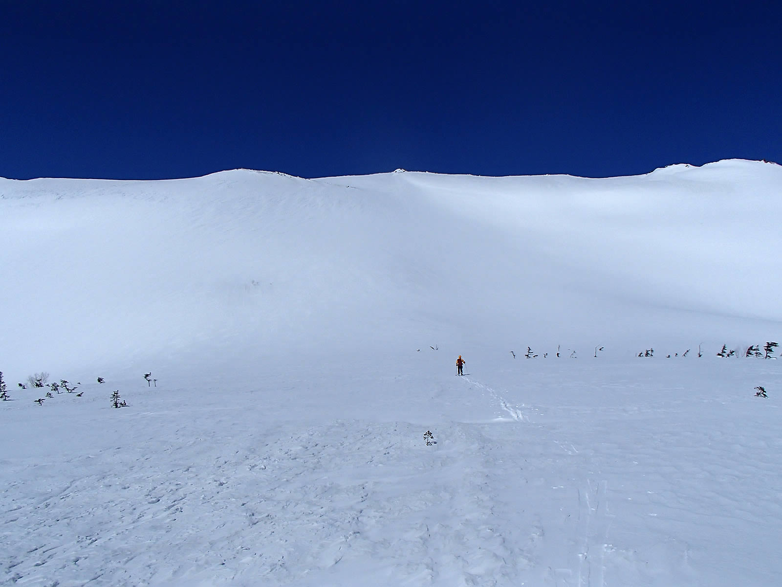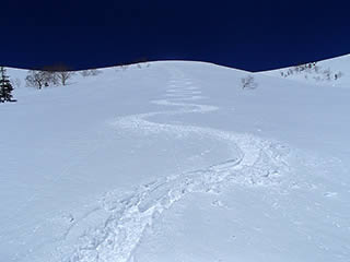 途中で先行者のトレースに合流。雪は風で少しパックされていてさらさら感はありません。
