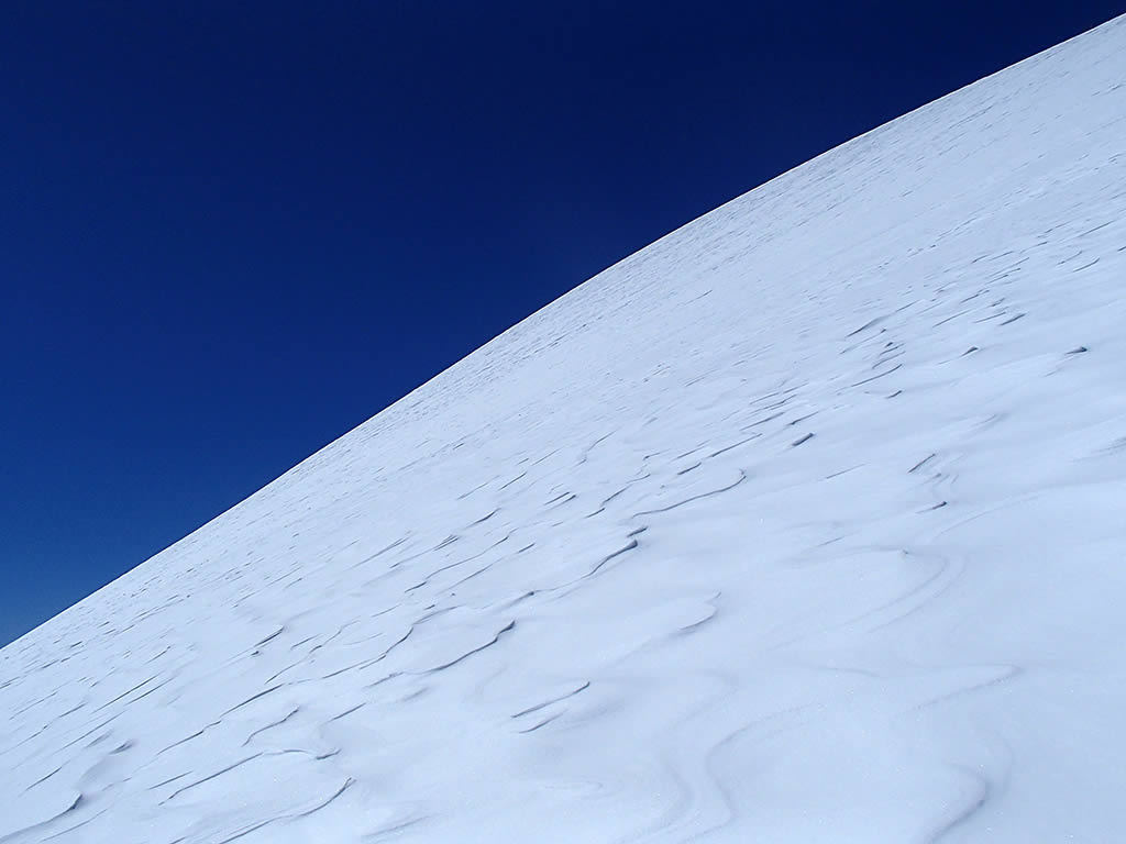 登っている左側。雪面に風による影響がありますが、この辺りの雪は実際には柔らかかったです。