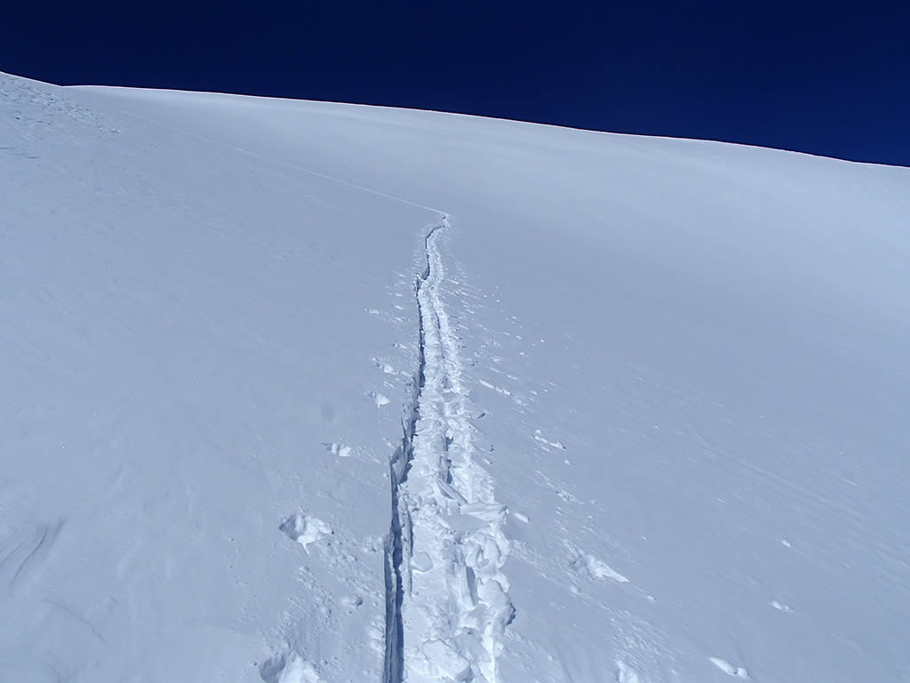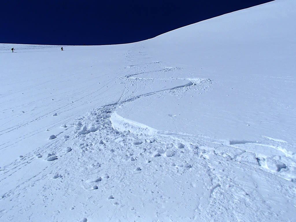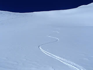 シュプールをズーム。私のシュプールが中央で、左側のシュプールは先行者のものです。この時点でまだ二人しか滑り降りていませんでした。