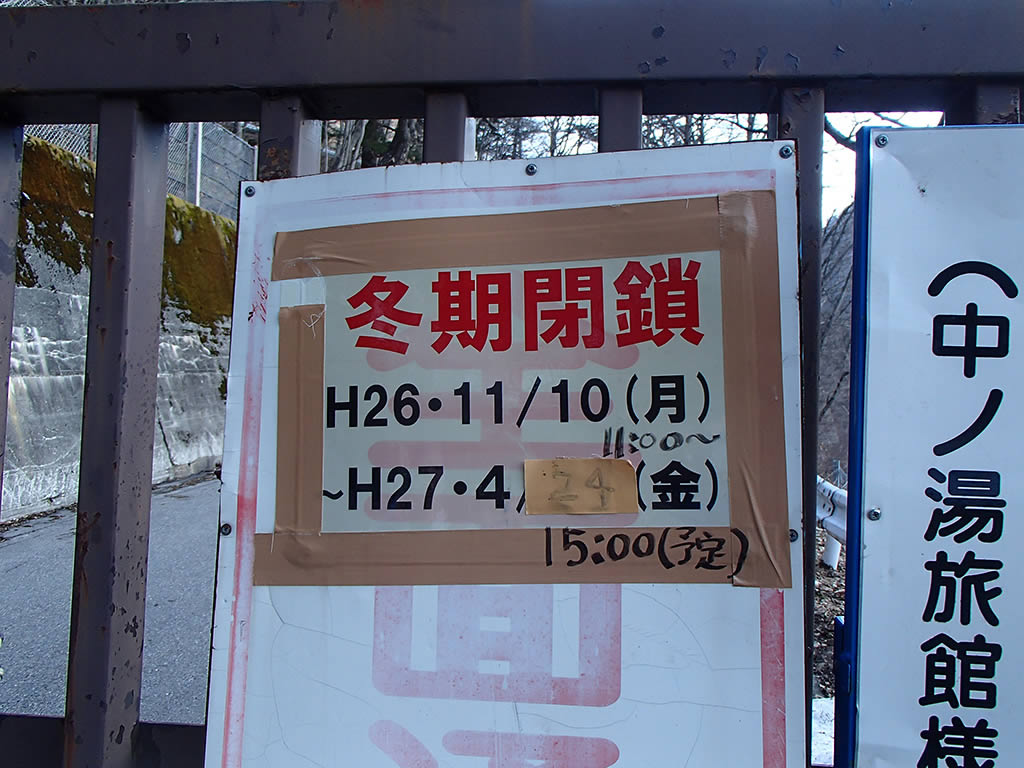 自宅を5時10分に出発し、新中ノ湯登山口に向かいます。ところが6時43分、国道158号線旧道に入ろうとしたところ、なんとまだゲートが閉まっているではないですか。どうしたんだろうと車から降りて表示をよく見てみると、冬季閉鎖解除の日付が4月24日に訂正されていたのでした...。ショック!。
