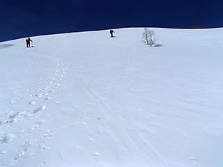 滑る準備をし、10時25分、滑り始めますが、いったん左側の斜面に入ってみます。ここは西風が強風時は新雪が吹き溜まってさらさらパウダーを楽しめる斜面でもあるのですが、今回はどこもハードパックされていました。ずーっと北側までトラバースすればもしかしたら変わったかも知れませんが、ビンディングと靴をベルトで縛ってあるだけでは無理が出来ません(^^;。